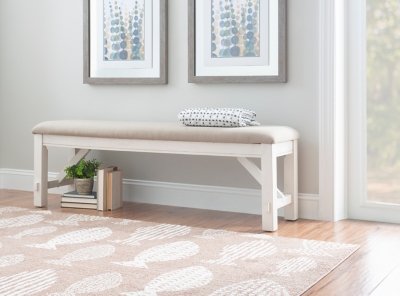 Outfit any room with this perfect bench. It features traditional straight lines and a simplistic style. A solid tan fabric in a basketweave construction covers a plush, comfortable seat. It has a durable rubberwood, MDF and Ash veneer construction in a smokey white finish, which delivers an updat