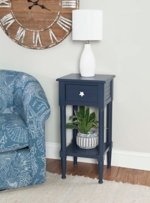 Add coastal ambiance to your favorite space with this lovely nautically themed end table. Featuring a navy blue finish, this square wood table is the perfect place for a lamp and a cup of coffee while relaxing with a book.