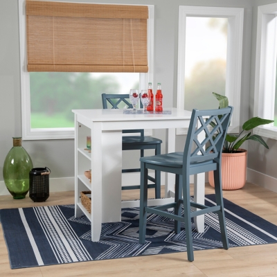 This space saving 3-piece counter height set with a coastal cottage design is sure to please in any setting. The counter height table has a decorative open shelving where you can display a multitude of items.
