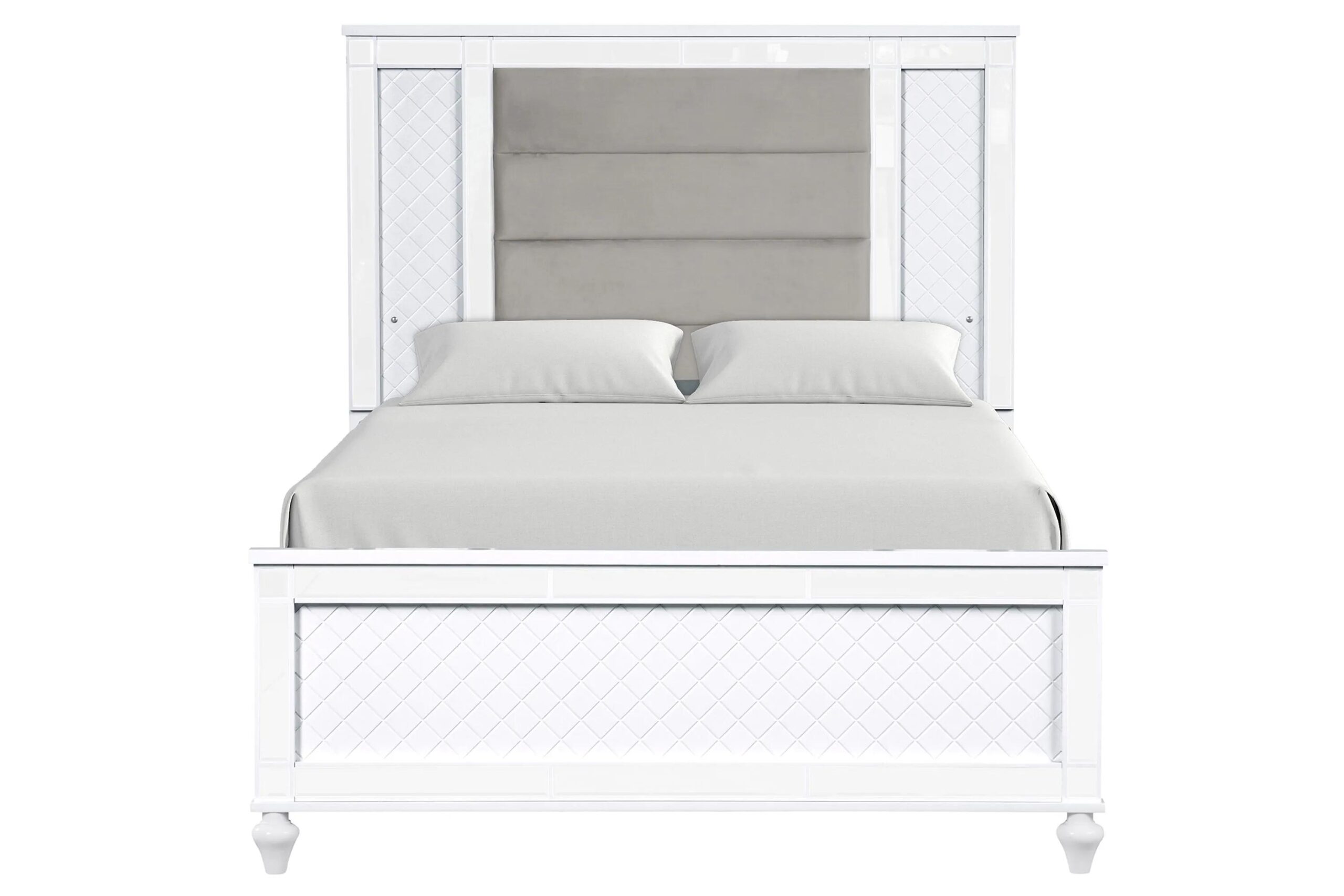 Livorno Bed features Embossed Wood with an X Design and Mirror Trim on the Headboard and Footboard. Upholstering on the Headboard is in Gray Velvet with a Soft Suede Feel. LED Lighting Accents On the Headboard for a Completely Unique Look.