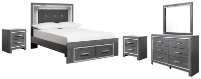Reminiscent of Hollywood glamour of yesteryear, this bedroom set with full bed with storage, dresser/mirror and two nightstands interprets luxury in a decidedly modern way. Headboard details include button-tufted upholstery, faceted faux crystals and LED lights enhanced with remote-controlled set