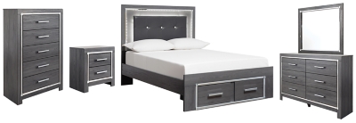 Reminiscent of Hollywood glamour of yesteryear, this bedroom set with full bed with storage, dresser/mirror, chest and nightstand interprets luxury in a decidedly modern way. Headboard details include button-tufted upholstery, faceted faux crystals and LED lights enhanced with remote-controlled s