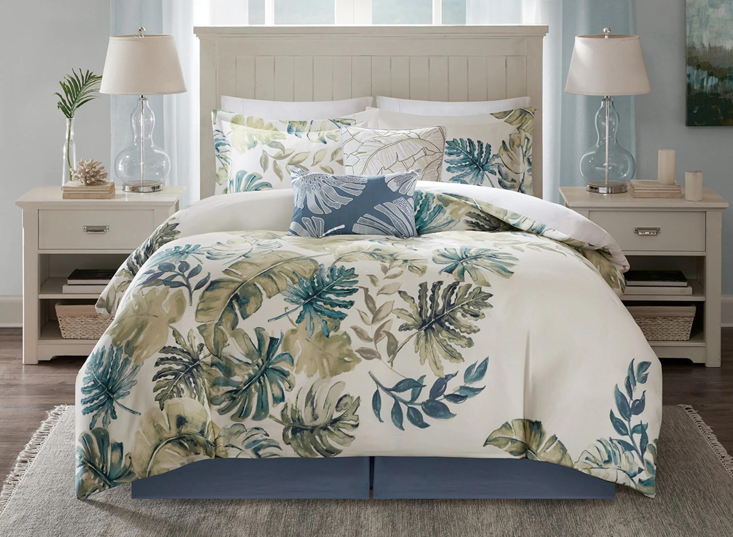Awake in paradise with the Lorelai full 6-piece comforter set. Showcased against a crisp white ground, gorgeous hues of green and blue compose a lush coastal pattern of oversized tropical plants. Two individually hand-cut shams bring the coastal pattern to the head of the bed, while the soft blue