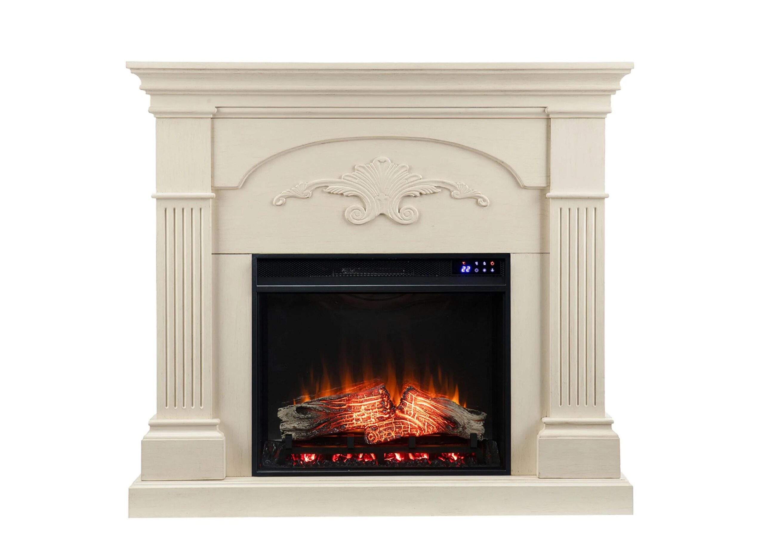 Handsome woodwork brings a traditional touch to modern convenience in this Lucca Fireplace. Glowing faux fire logs add ambiance with flickering LED flames and lifelike embers, with or without heat. The creamy ivory finish blends well without blending in, creating a traditional style focal point i