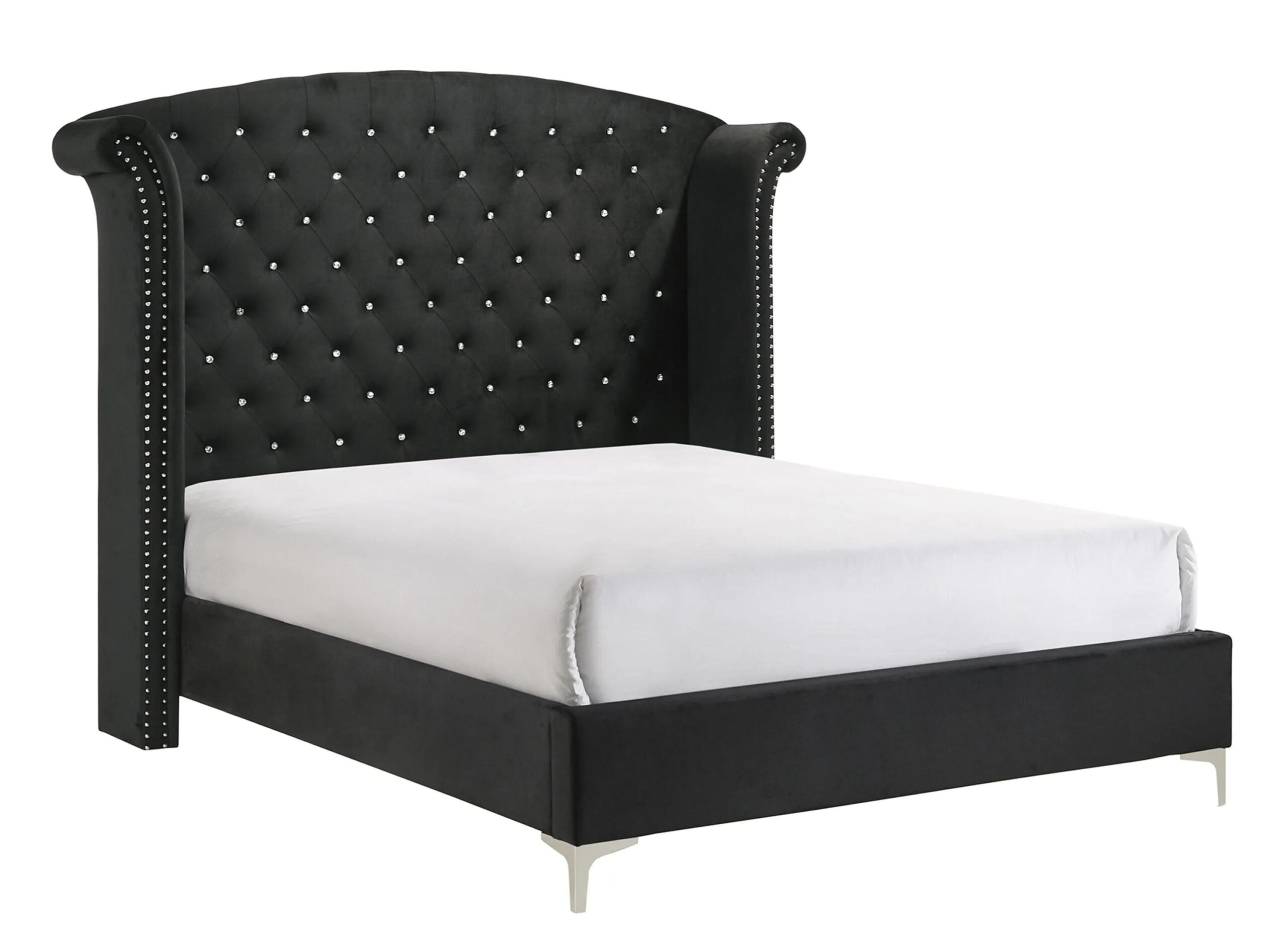 Lucinda bed – the epitome of elegance and sophistication. With its black upholstery and sleek glam design, this bed will add a touch of luxury to any bedroom. The crystal tufted headboard and nailhead trim detailing give it a unique and stylish look that will make it the centerpiece of your