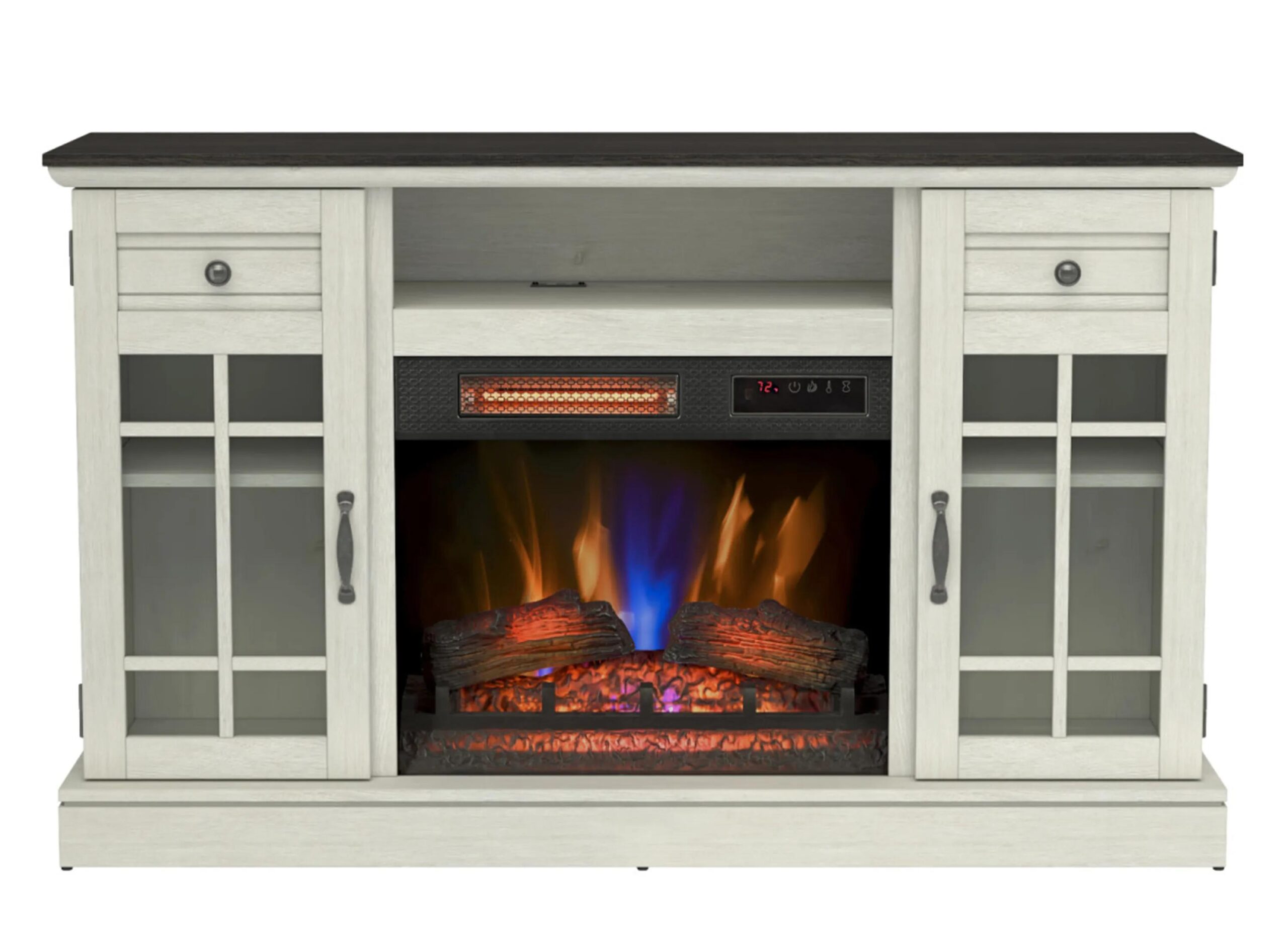For charming style and toasty heat, look no further than the Madeline Electric Fireplace TV Stand. Supplemental heating means you can save money by turning down your thermostat and adding warmth to any room you choose – up to 1,000 square feet! Captivating 3D flames can be used with or with