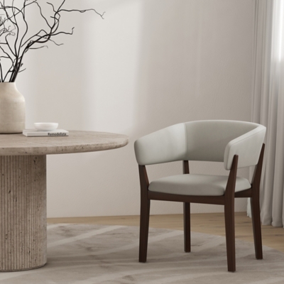Designed with sculptural elegance and refined comfort, this dining chair brings a timeless sensibility to any space. The curved silhouette is framed in dark walnut-finished beech wood, wrapping around a plush, foam-filled seat and backrest upholstered in rich faux mohair.