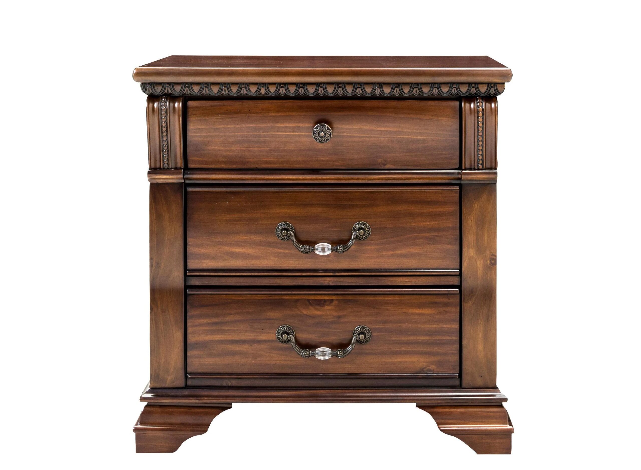 With old world style and fine carved detail, the Mariana nightstand calls to the mind the stately look of yesteryear. This piece features a rich espresso finish and classic design, which includes antiqued bronze-looking hardware with faux crystal knobs.