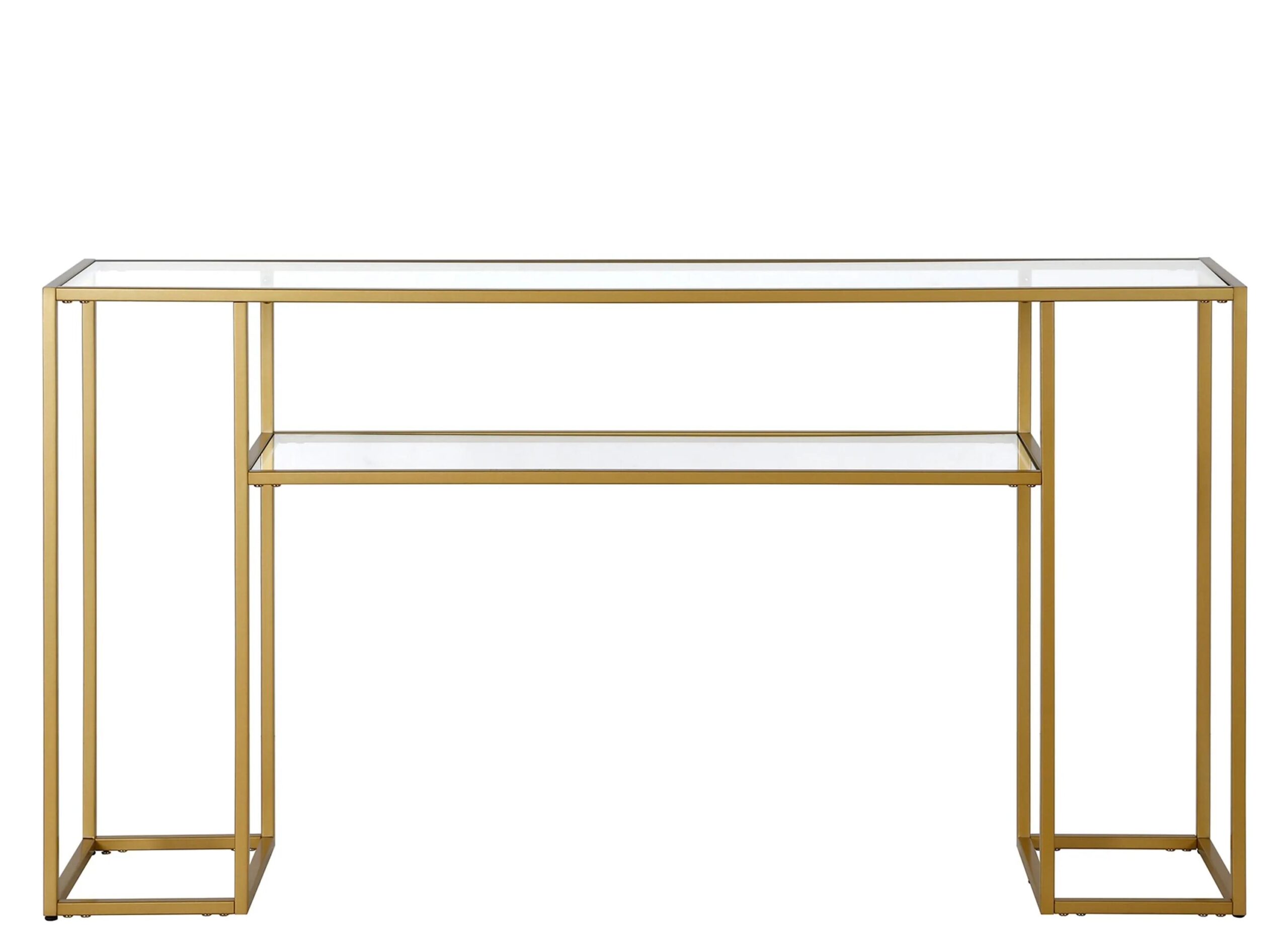 The Art Deco era blends seamlessly with modern design of the Marilyn Console Table. The clean and elegant frame, paired with glass top and shelving, make for an elegant accent table sure to draw attention in your entryway or living space.