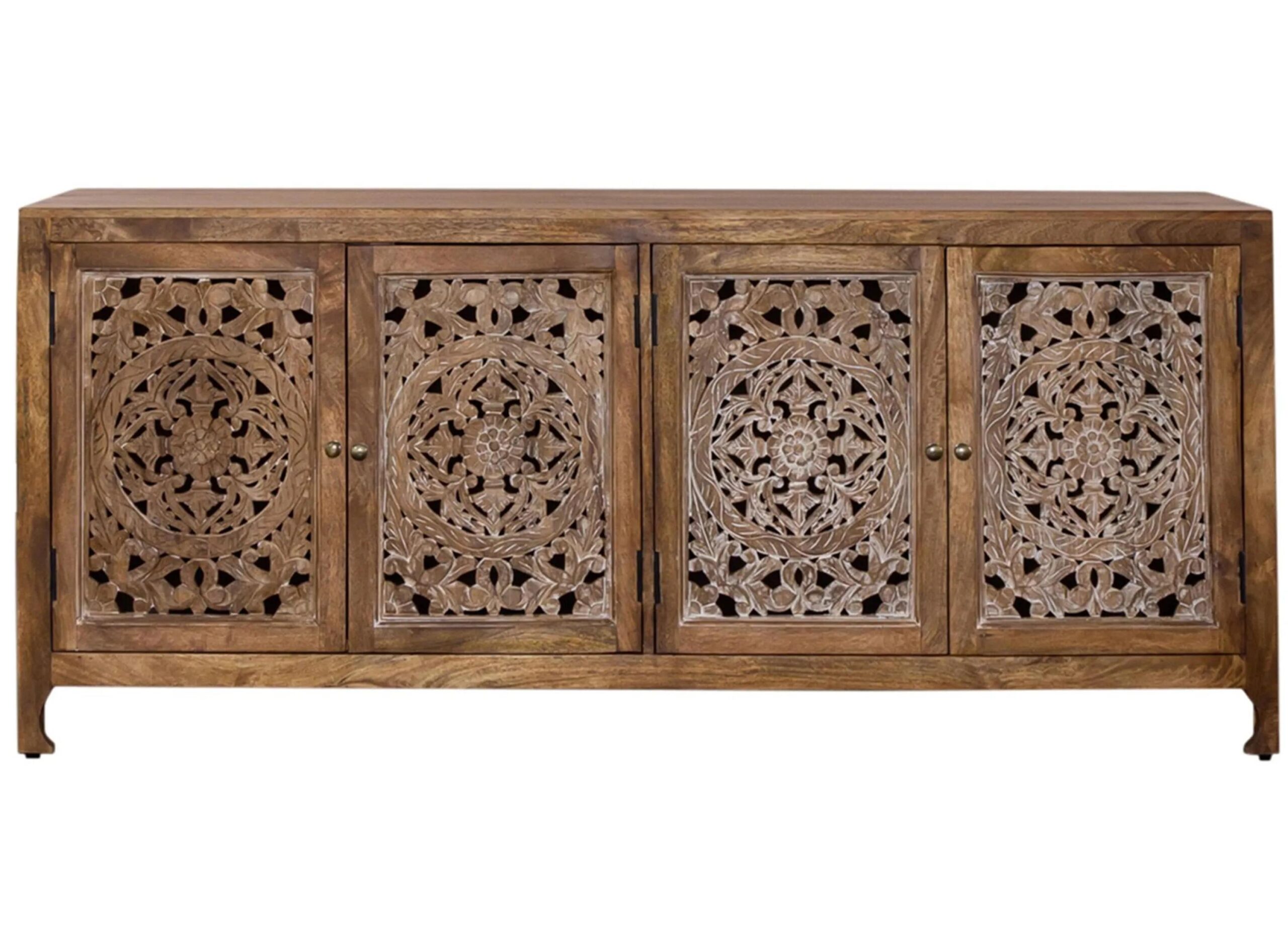 The Marisol 4 Door TV Stand gives you that Boho chic feel that is so popular today. Boho is a mix of colors, styles, and materials to create a carefree causal comfortable space. Crafted of solid mango with a soft wash grey finish.