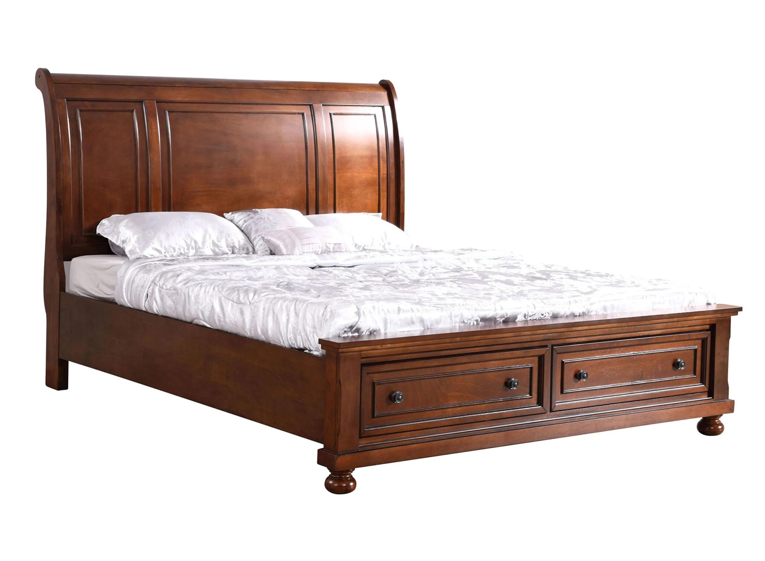 The Meade Sleigh Storage Bed features real wood veneers. Full extension drawers in the footboard provides additional storage. A wood platform is used to support the mattress, so a box spring is not needed.