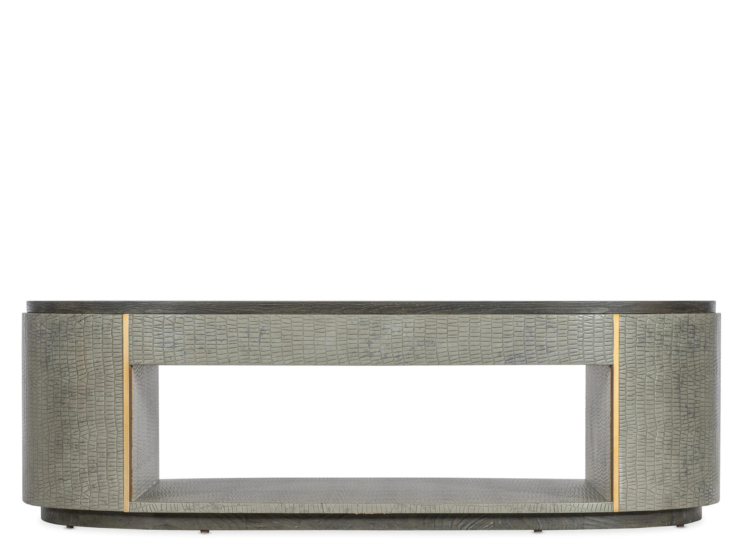 Melange Dylian Coffee Table has a gray crocodile exterior with gold metal accents and a dark wood top and base. Crafted of Pine Veneers and Robus Leather, it has an oval shape with an open shelf area.