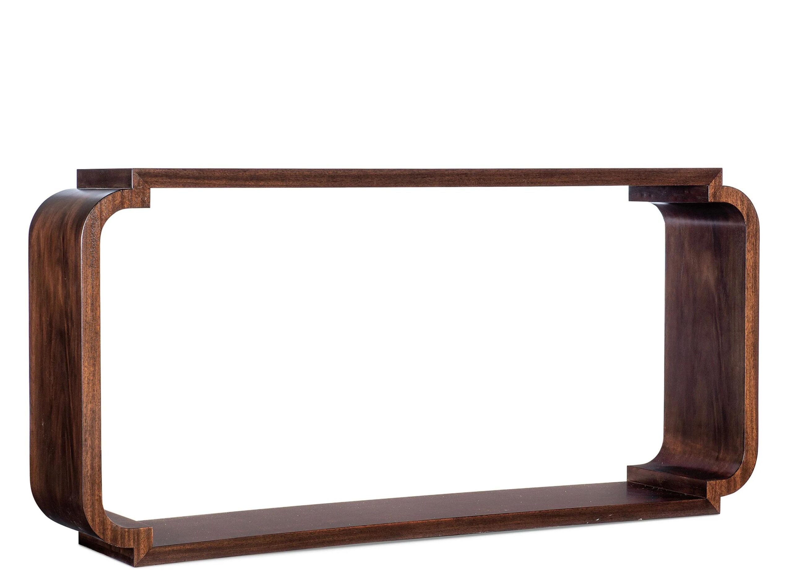 Airy and chic, the Melange Narrow Console Table is crafted in classic swirl mahogany veneers. In a slim rectangle shape only 12 inches deep, the svelte table has curved wood sides, and the base of the table creates open space for storage or decor.