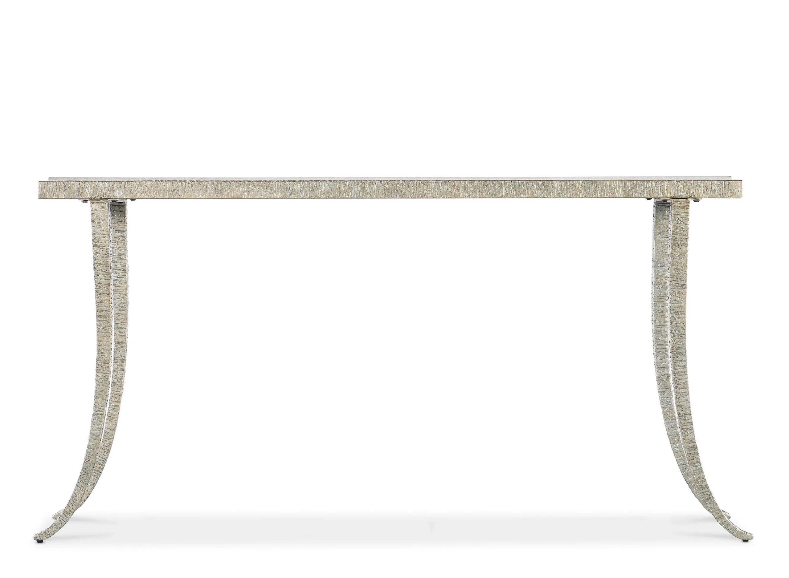 Melange Sabre Console Table featuring a silver textured metal frame, splayed legs and a marble top. This metal and marble beauty has a narrow 14-inch depth to make it practical for even tight spaces.