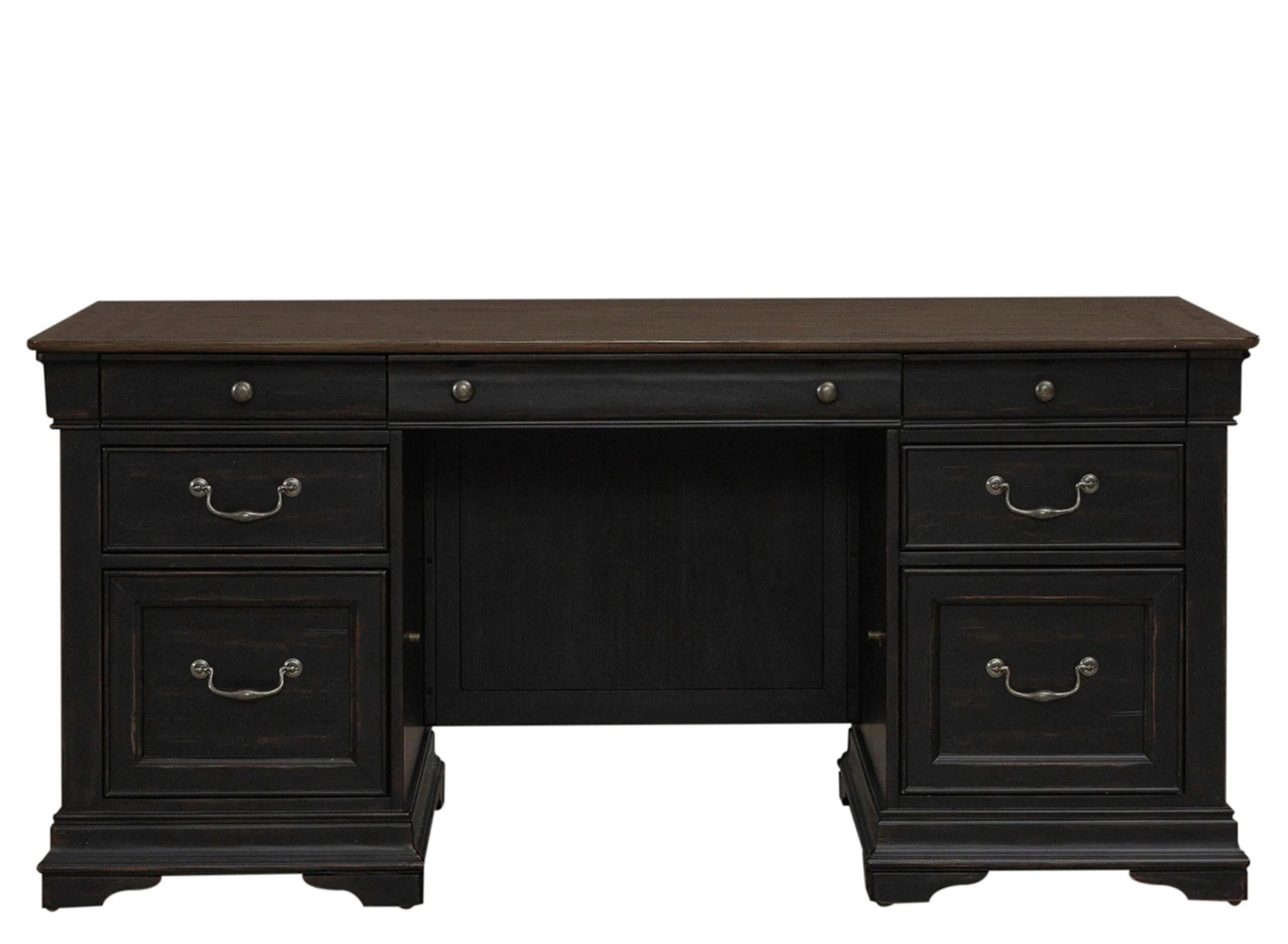 Creativity starts with the Meritage Jr Executive Desk. Meticulously crafted using Poplar solids with Birch and Maple veneers, this piece features an Aged Charcoal with rub thru and Caramel finish. There are seven drawers with wood-framed fronts, each drawer is designed to provide ample storage sp
