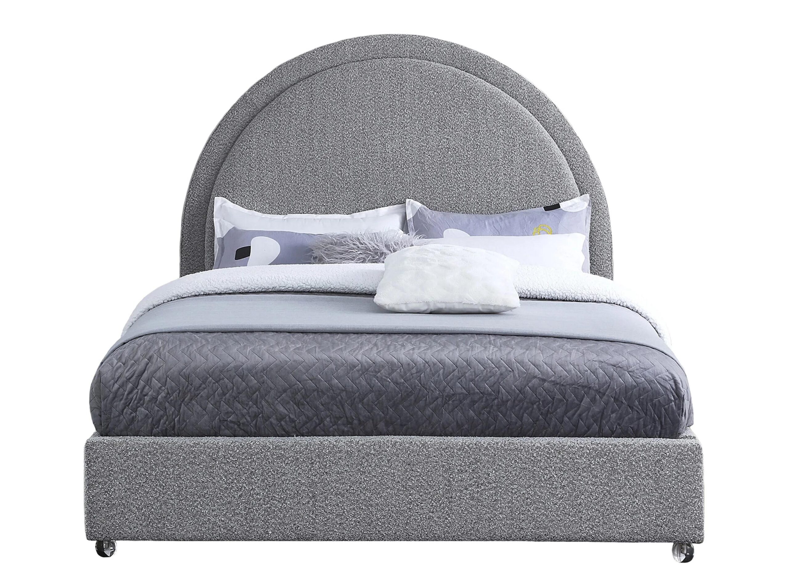 Milo Bed in rich grey boucle fabric, so it’s soft to the touch and regal to the eye. The star of the show is the bed’s rounded headboard, which stretches out tall above you for a look that oozes regality and sophisticated charm.