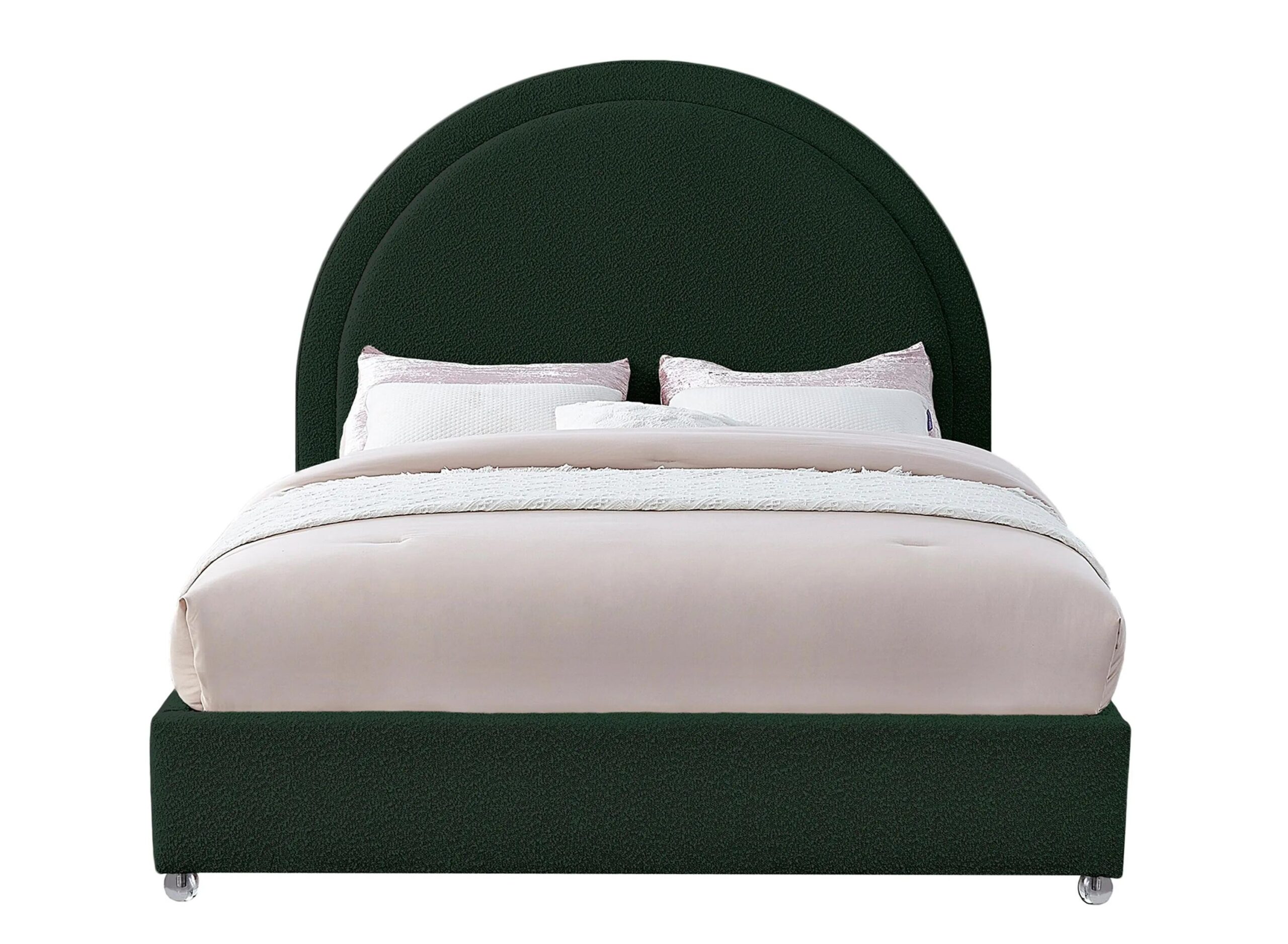 Milo Bed in rich green boucle fabric, so it’s soft to the touch and regal to the eye. The star of the show is the bed’s rounded headboard, which stretches out tall above you for a look that oozes regality and sophisticated charm.