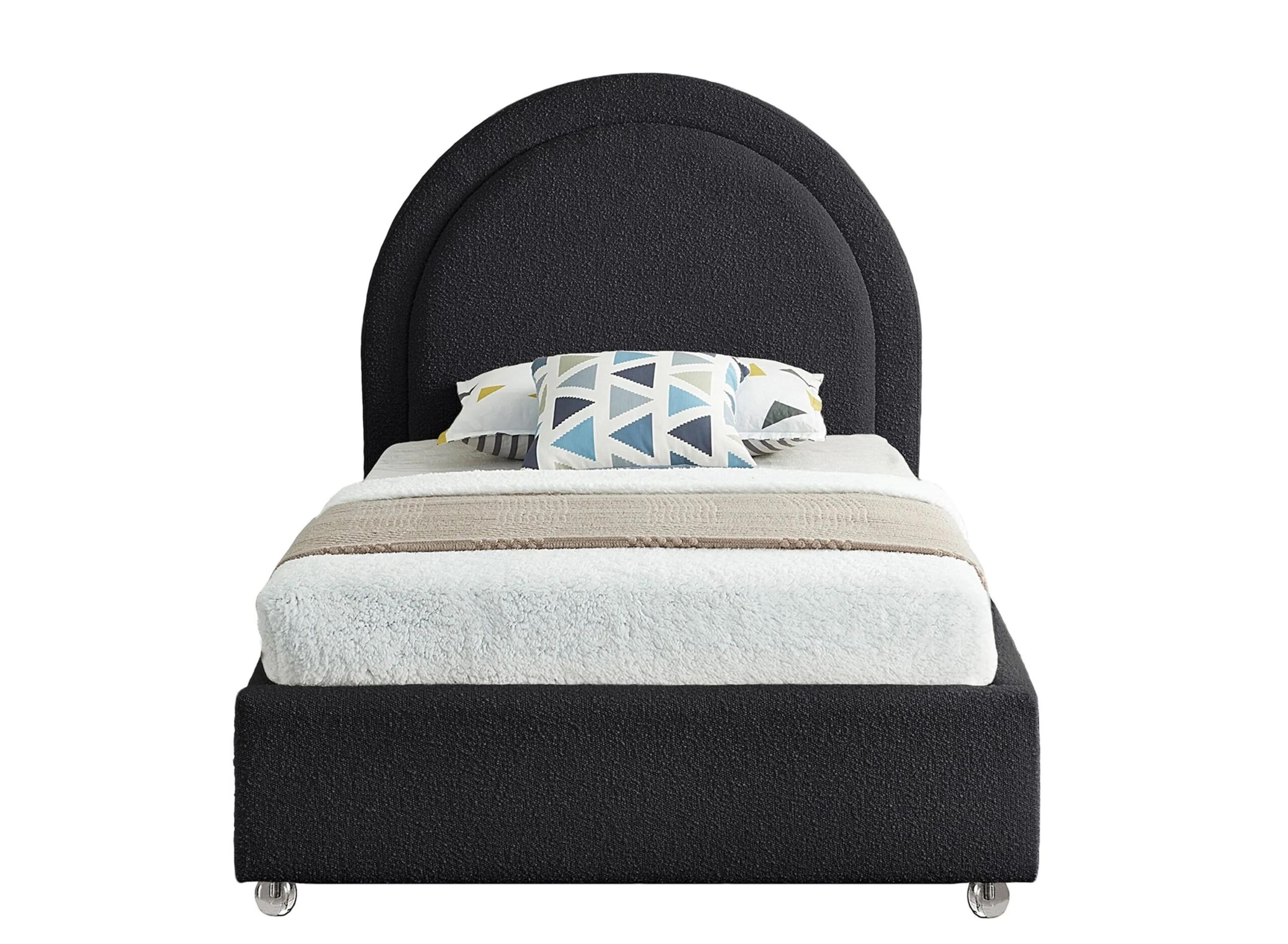 Milo Bed in rich black boucle fabric, so it’s soft to the touch and regal to the eye. The star of the show is the bed’s rounded headboard, which stretches out tall above you for a look that oozes regality and sophisticated charm.