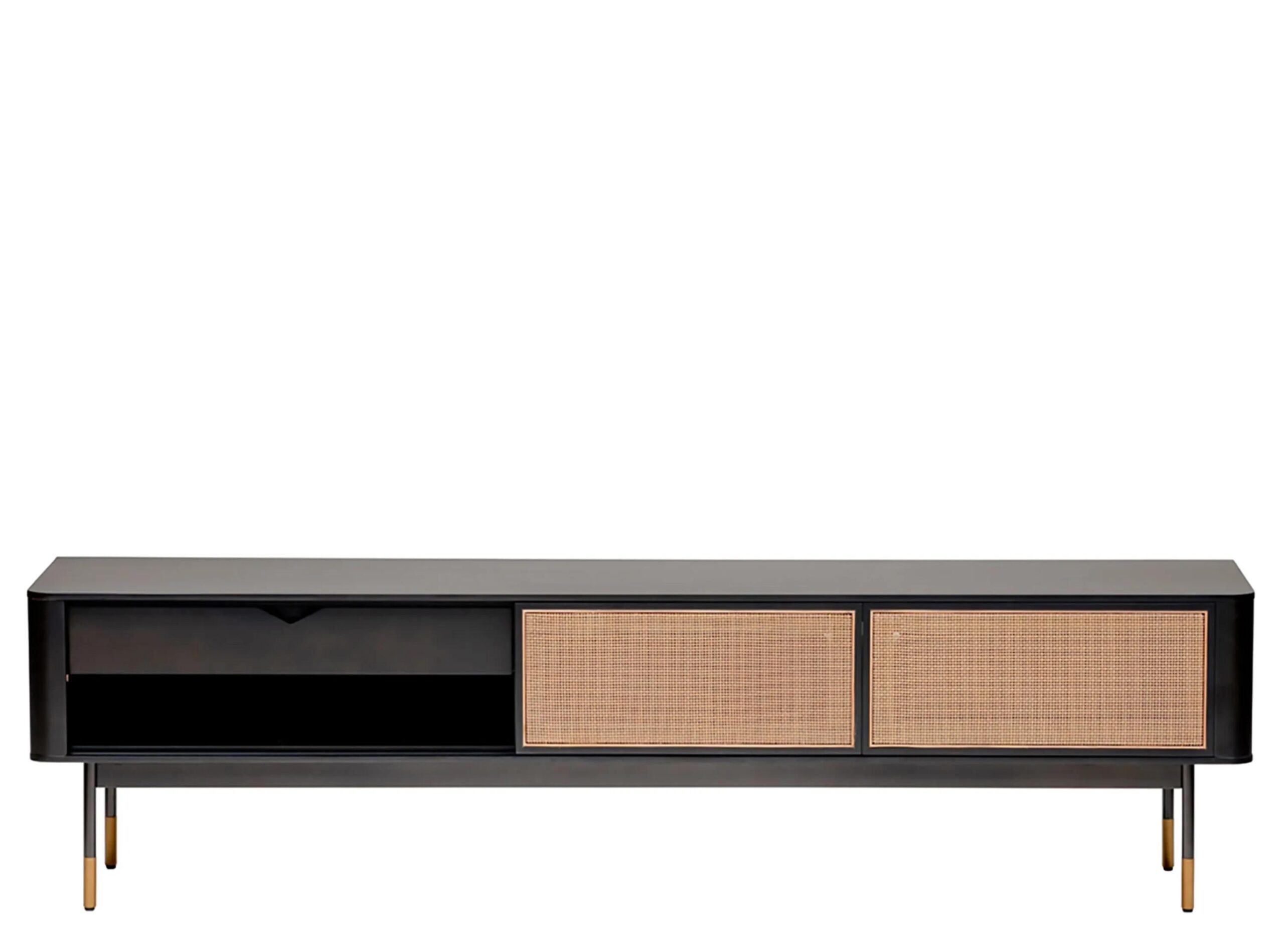 The Miriam Media Stand features a solid wood outer frame and steel legs with bronze lower accents. There are two wicker sliding compartment doors with magnetic door holders to set the doors in place.