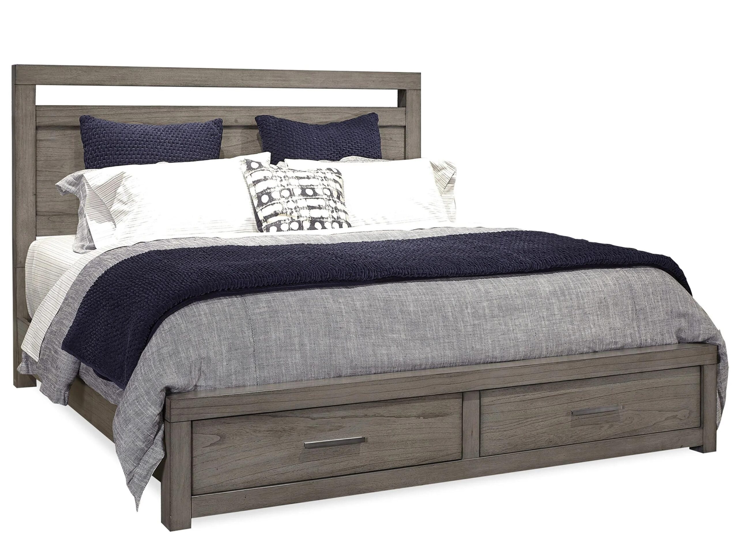 Modern Loft Panel Bed with Storage is made up of beautiful Mindi veneers with a distinctive grain pattern and includes a wide variety of special features and functionality. The aged bronze finish hardware and clean lines offer a look that is both stylish and timeless.