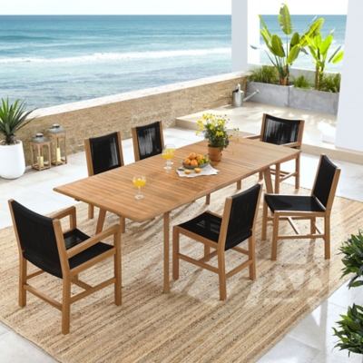 Refresh your outdoor dining experience with the 7-Piece Teak Rectangular Table Patio Furniture Set. This modern outside patio set includes the Vienna Extendable Teak Dining Table and 6 Vienna Outdoor Dining Chairs, with 4 armless chairs and 2 with armrests, effortlessly accommodating larger gathe