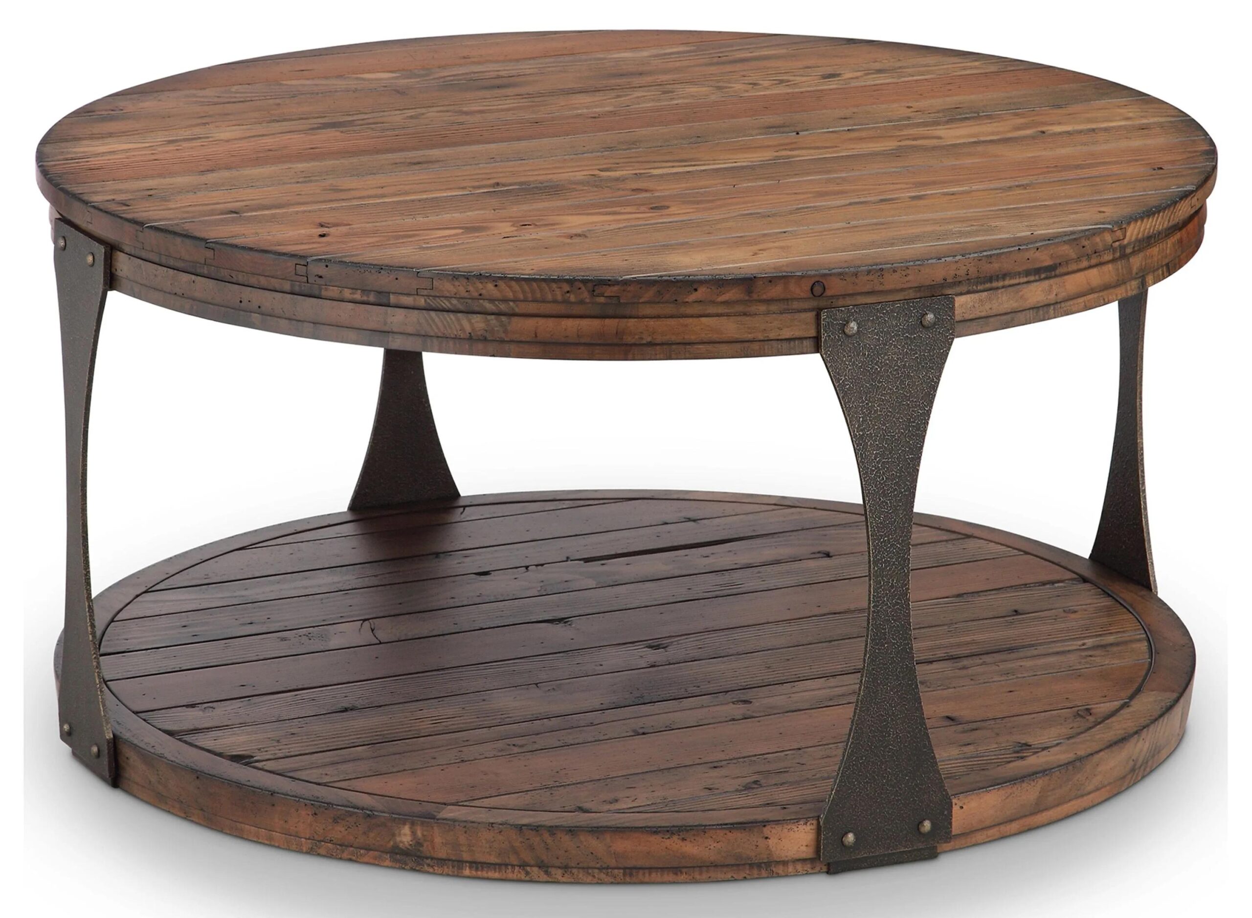 Rust metal accents with reclaimed wood in a bourbon finish, the Monarch Montgomery Round Coffee Table embodies everything your urban dwelling, fishing, or hunting lodge should be with plank tops and aged iron metal accents.