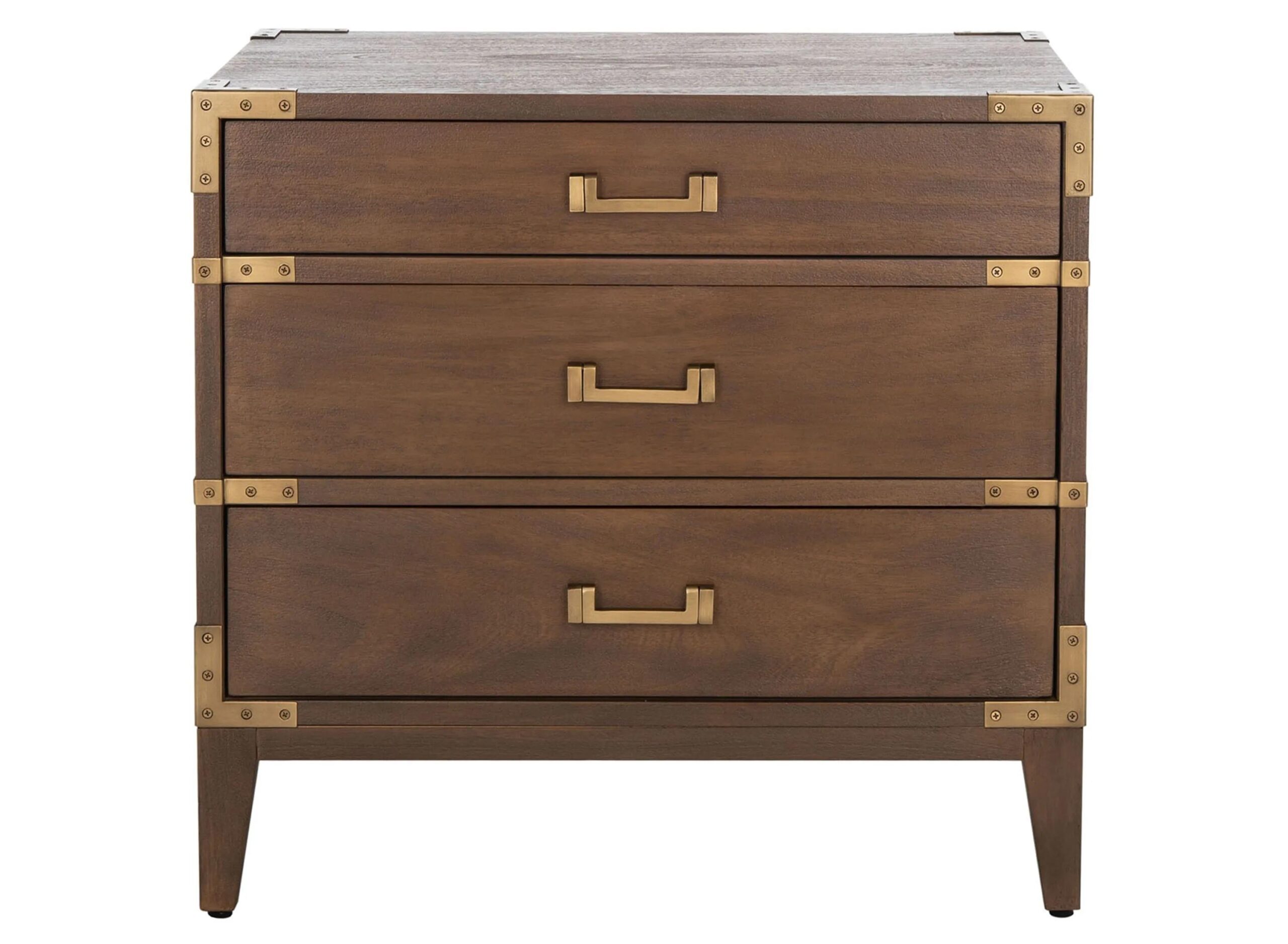 This stunning Navene Nightstand is a perfect pairing of industrial sass and couture class. Inspired by campaign style steamer trunks, Navene’s antiqued brass hardware and nailhead details give its brown mahogany frame a fashion-forward edge, while three drawers provide ample bedside storage