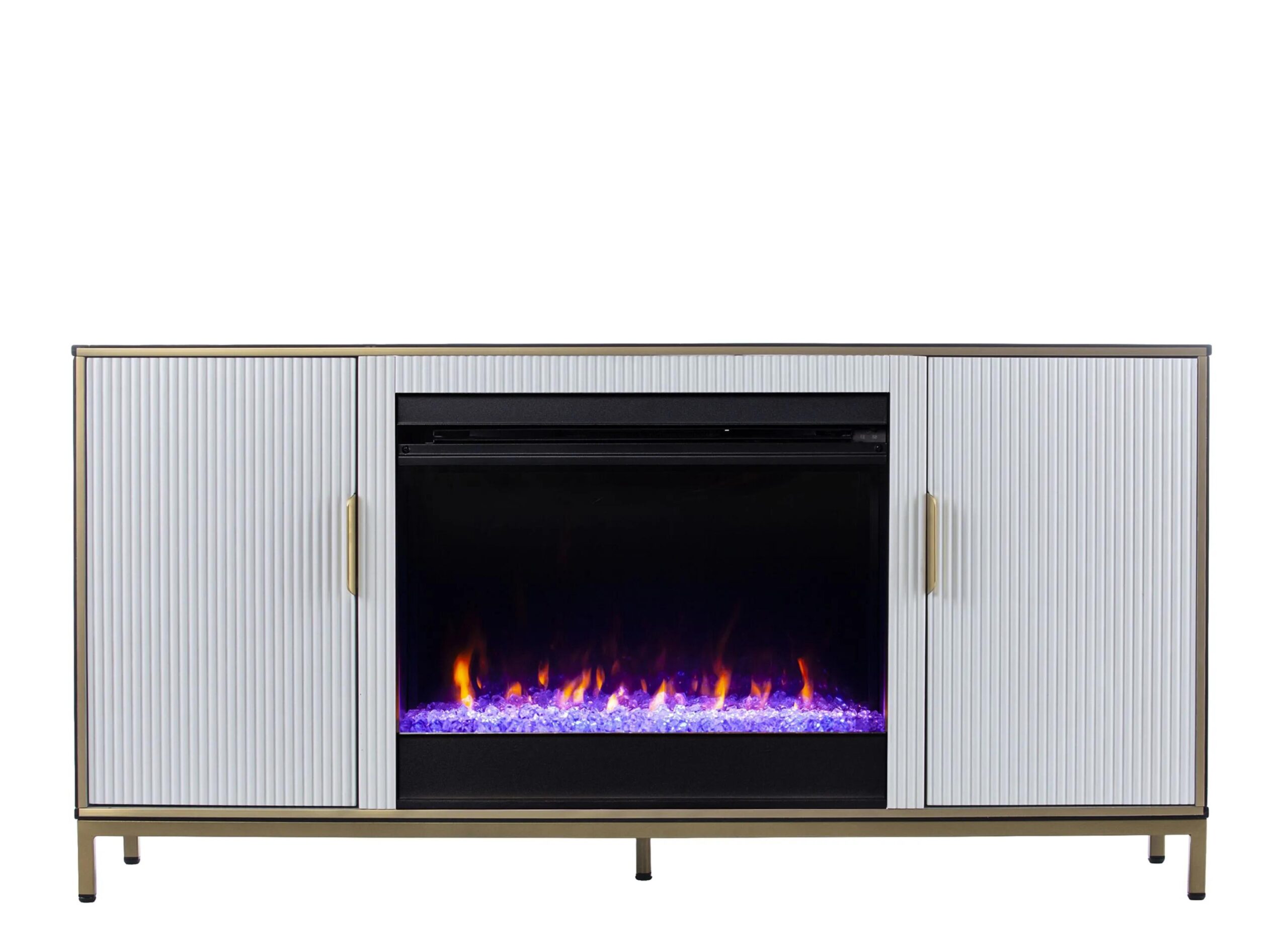 Newcastle Daltaire Fireplace Media Console warm up your home in modern style with this electric media fireplace. A bold black and white design crafts a contemporary look, while the textured doors conceal movies, consoles, and games.