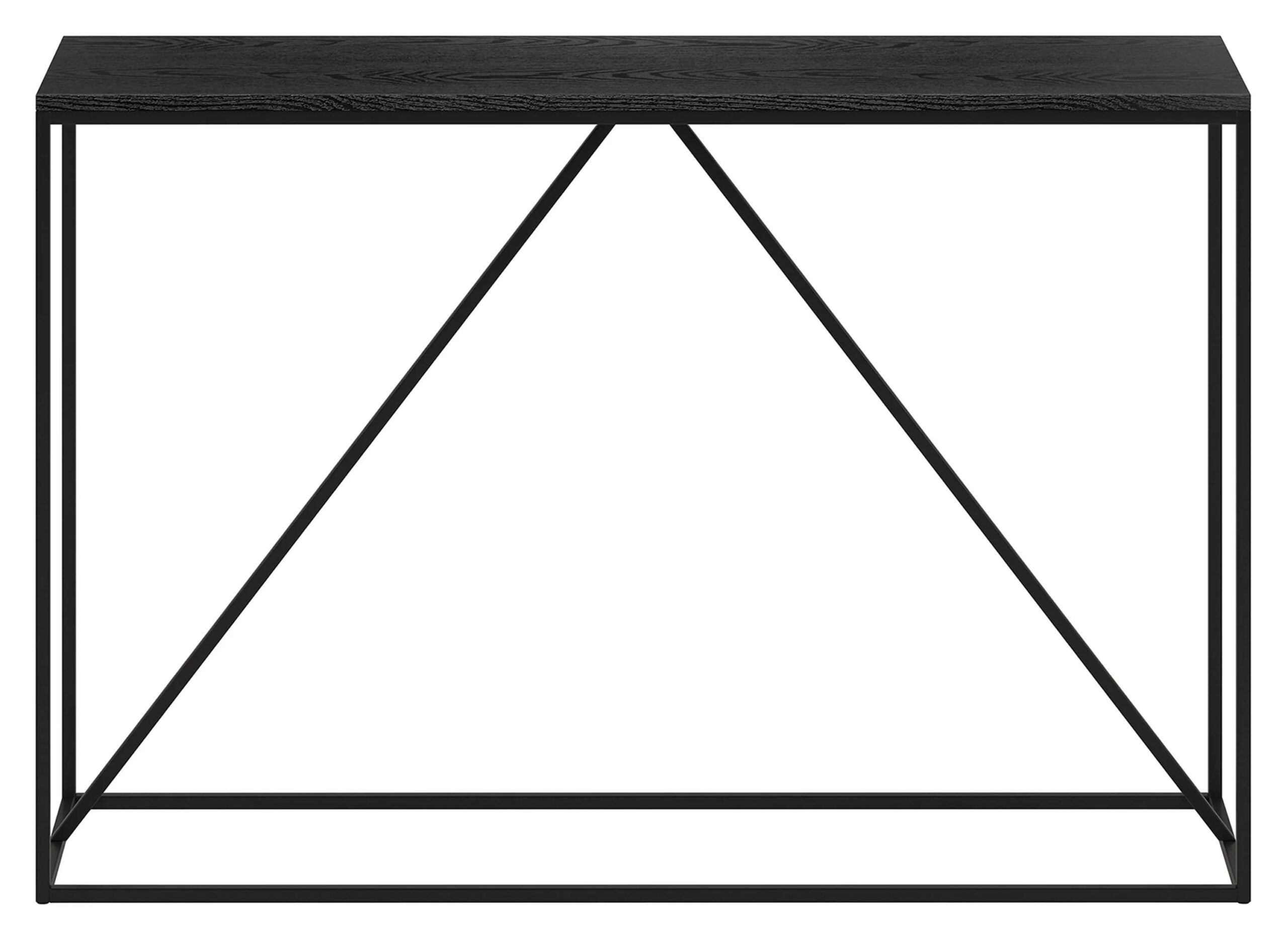 This Nia Console Table is built for utility and design, featuring an on-trend wood-look top with a 40 lb. weight capacity. It’s thoroughly modern blackened bronze frame features a diagonal center support that adds stability and visual interest.
