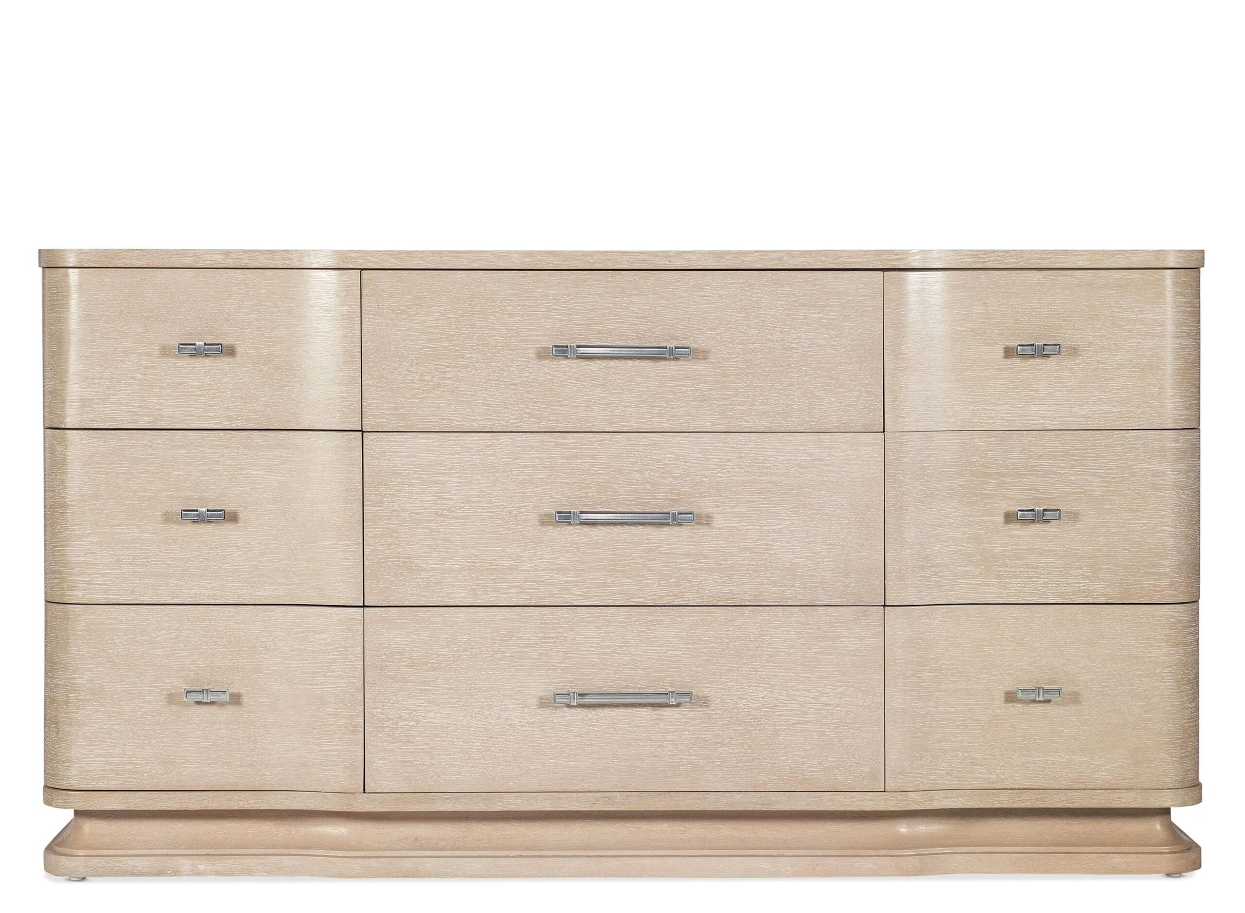 With a curved breakfront design and soft, flowing edges, the Nouveau Chic Nine-Drawer Dresser brings a clean neutral palette and casual modern style to your space. Crafted of Cathedral and Quartered Oak Veneers, it is finished in the serene Sandstone with light wire brushing.