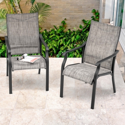 The 2-Piece Outdoor Dining Chair Set features breathable textilene fabric and rust-resistant, lightweight aluminum frame. The textilene fabric ensures optimal ventilation, providing a comfortable seating experience, while the durable aluminum frame adds both stability and a touch of modern elegan