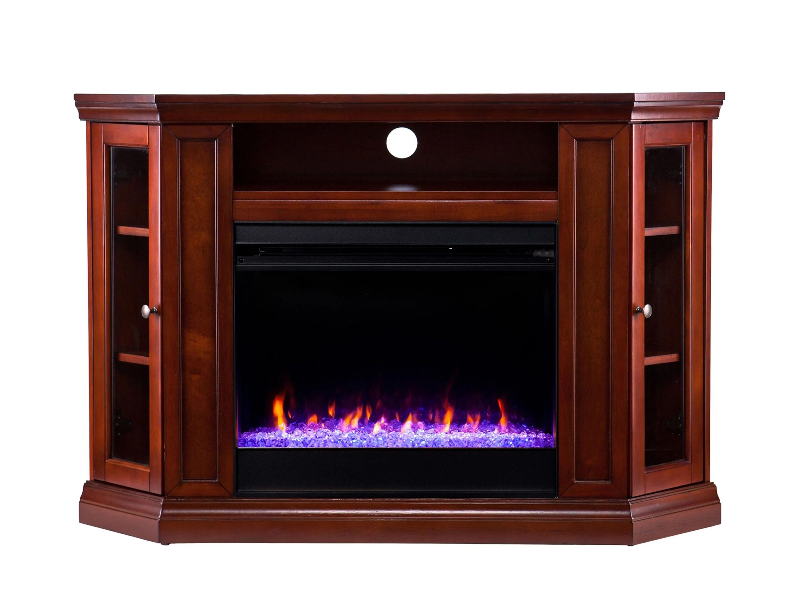 For entertainment enthusiasts, this Oldham media fireplace tops the charts. Triangular media cabinets on either side of the firebox provide plenty of space for your favorite media selections. The spacious media shelf provides a convenient cord control, while the collapsible panel allows for versa