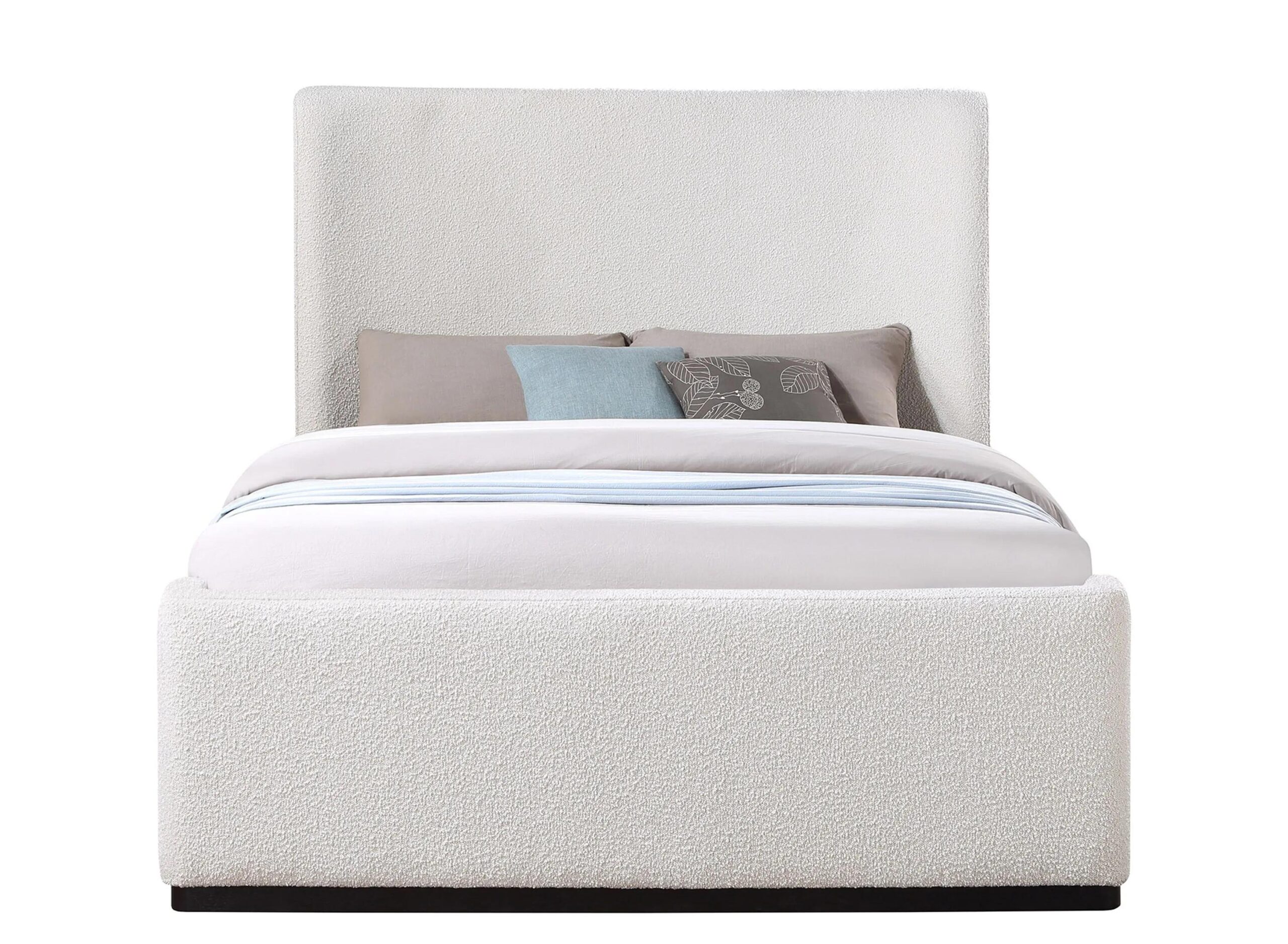 Oliver Bed is comprised of rubber wood with a solid wood black wire brush finish, upholstered with rich cream boucle fabric, giving it an elegant appearance. A high headboard gives the bed a contemporary design, which fits any bedroom space.