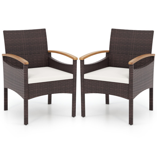 ● Hand-woven PE wicker surface for long-lasting elegance● Each chair comes with a seat cushion for more comfort● Smooth zippers make cushion covers easy to maintain● Ergonomic backrest and acacia wood armrests make you relaxed● Supported by heavy-duty metal frame for high stability● E