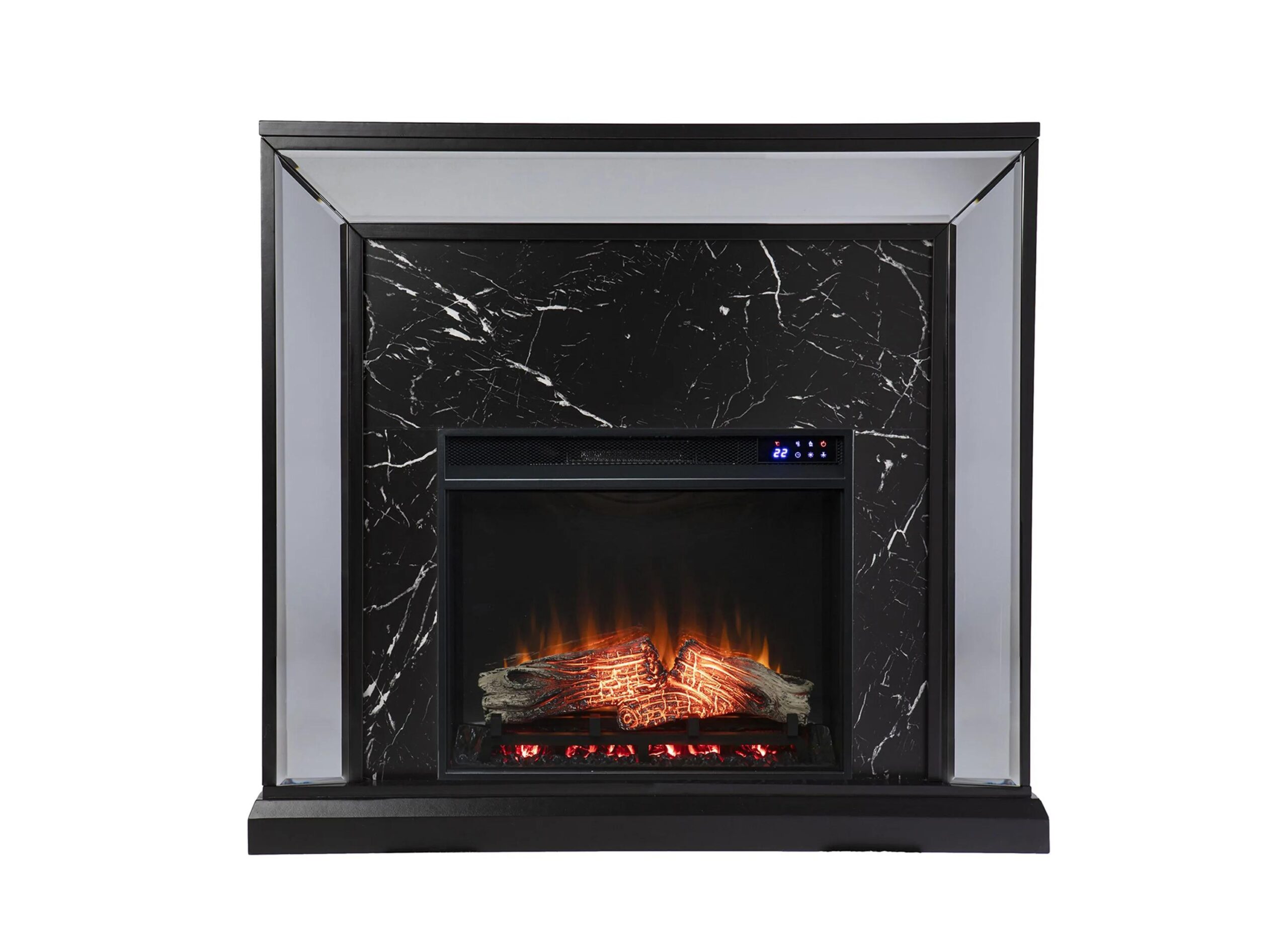 Glow up with this mirrored Penryn Fireplace. Reflective mirrored panels box in a faux marble surround, adding dimension to small spaces. Glowing faux fire logs add ambiance with flickering LED flames and lifelike embers, with or without heat.