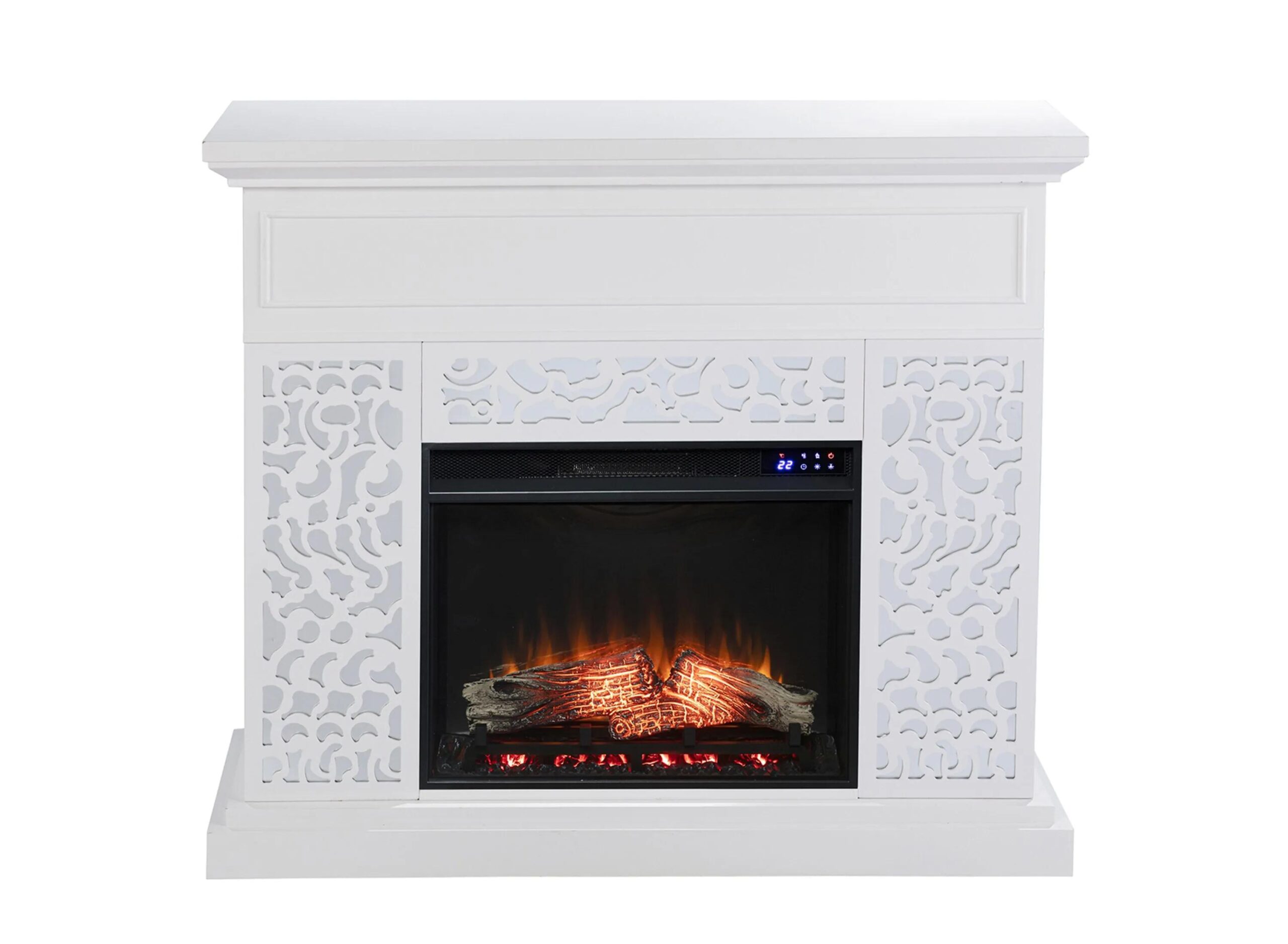 Add a touch of modern to your decor with this Philip Fireplace. A spacious mantel displays framed photos or a vase of flowers, while unique, lattice-inspired details highlight the mirrored surround.