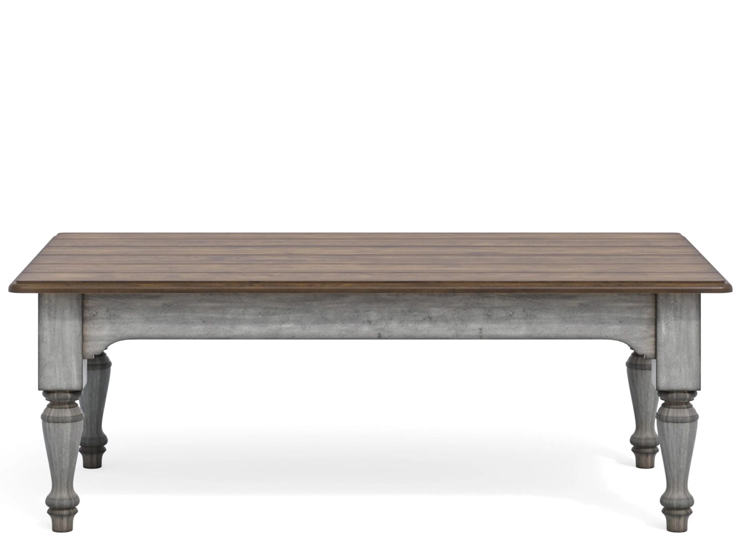 Transform your living room into a cozy cottage retreat with the Plymouth Coffee Table. A weathered graywash finish, medium brown planked top and turned legs create a charming vintage vibe, while the large tabletop provides ample area to place drinks and dcor.