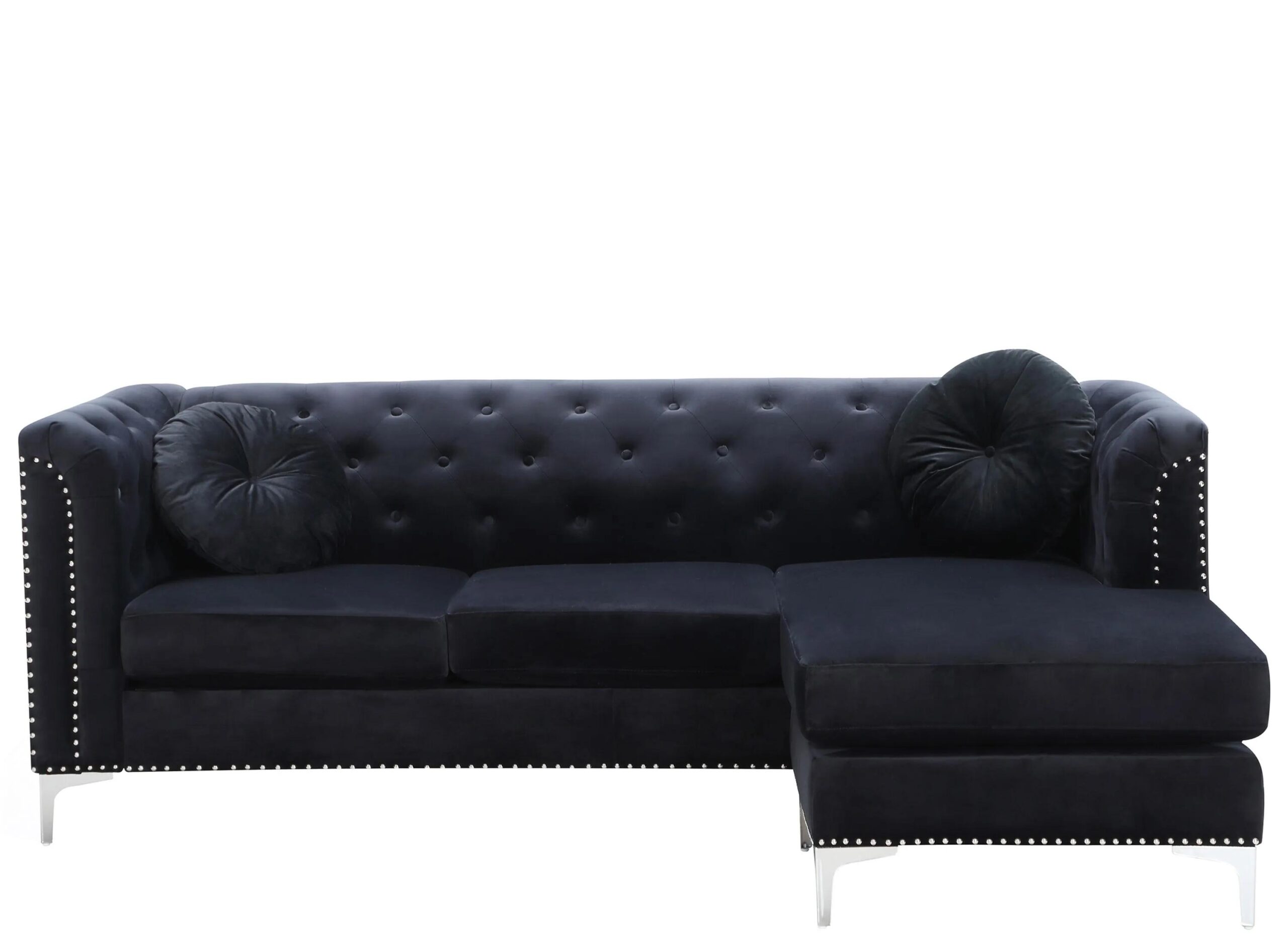 Soft, plush micro suede covers this dramatic Pompano 2-pc. sectional sofa, which can be reversed to be right or left facing. Featuring button tufting on the inside back and arms, chrome nail head trim, chrome feet and matching throw pillows.