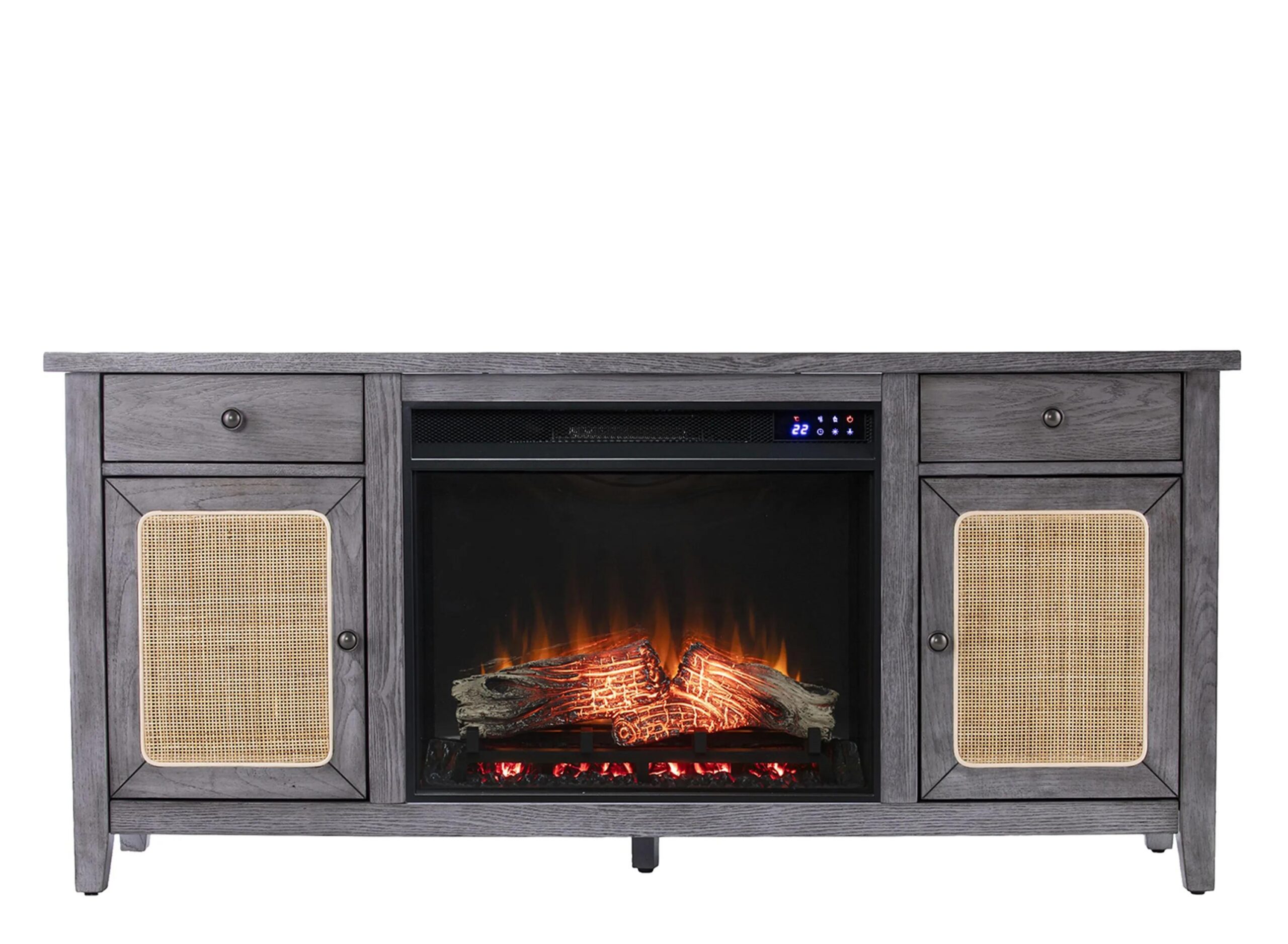 Raegan Fireplace Media Console warm up your modern farmhouse design with this fireplace media stand. Spacious cabinets neatly tuck away movies, games, and blankets, while two drawers store remotes and gaming accessories.
