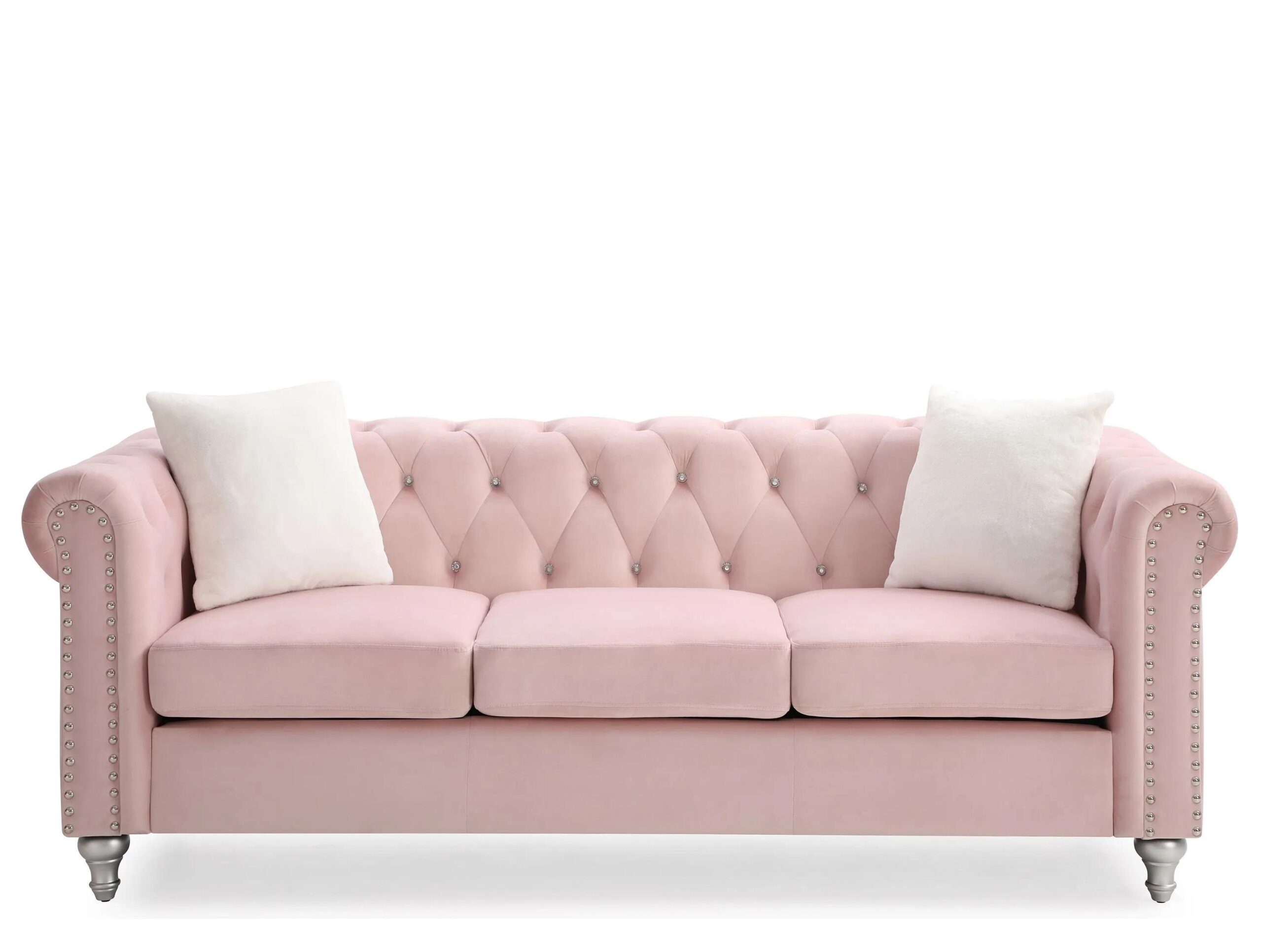 The Raisa sofa is a updated version of the classic chesterfield design. Soft micro suede velvet cover is tufted with faux jewels and set off with chrome nailheads for a stunning look. Pocketed coil seats assure you of long lasting comfort.