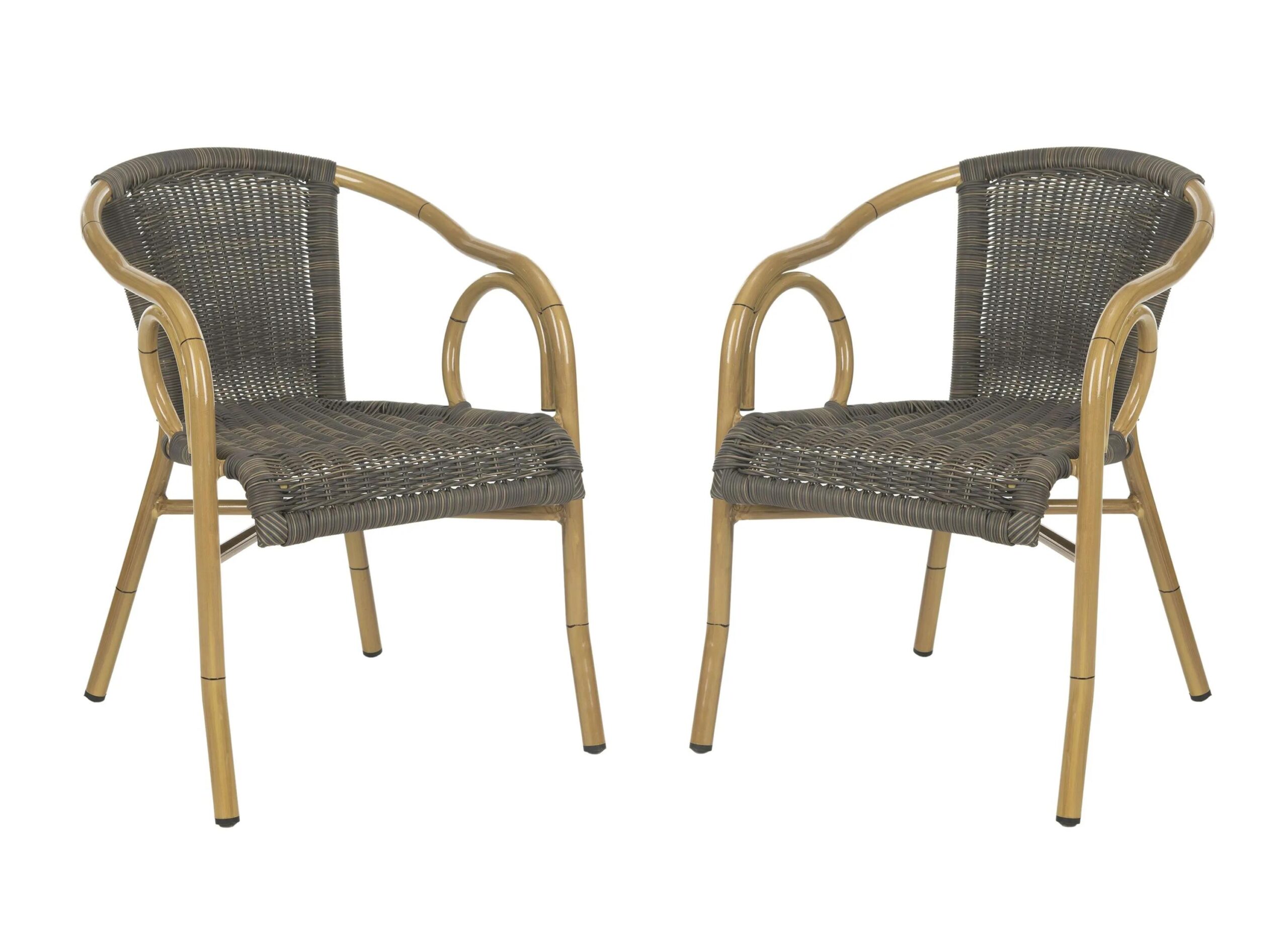 Retro chic style defines the set of two Ransin indoor/outdoor arm chairs by Safavieh. With aluminum frame finished and molded to create the look of bamboo, these pretty and practical chairs feature intricate PE wicker seat and back in chocolate brown.