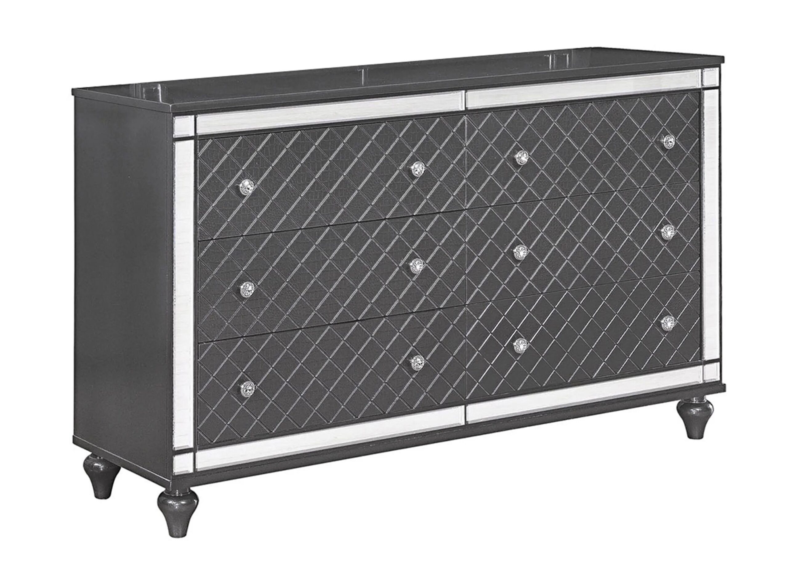 The Refina bedroom collection boasts of glamor throughout. Each piece is beautifully framed with a decorative beveled mirror accent that enhances the illumination from the touch-engaged LED back-light of the headboard and Mirror.