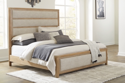 This California king upholstered bed’s classic yet contemporary good looks are hard to deny. Softly shaped posts and a light oak finish with wire-brushed wood grain texture lend an organic appeal to your soothing space.