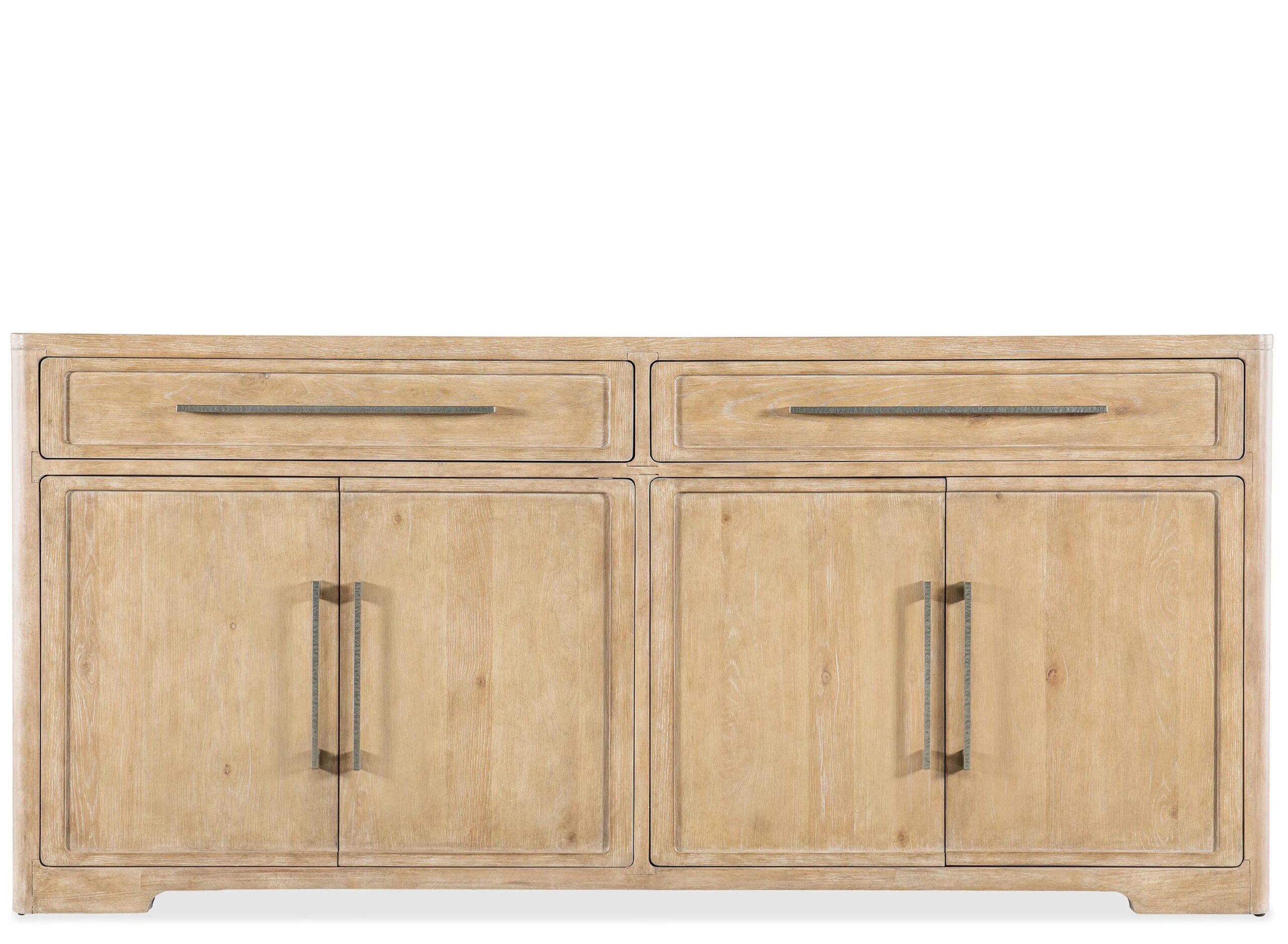 Retreat Buffet offers a delightful mix of natural materials in a clean and sleek silhouette. The case is crafted of Oak and Maple Veneers with a Travertine Stone inlay top and a sand-colored Dune finish to showcase the unique grain patterns of the wood.
