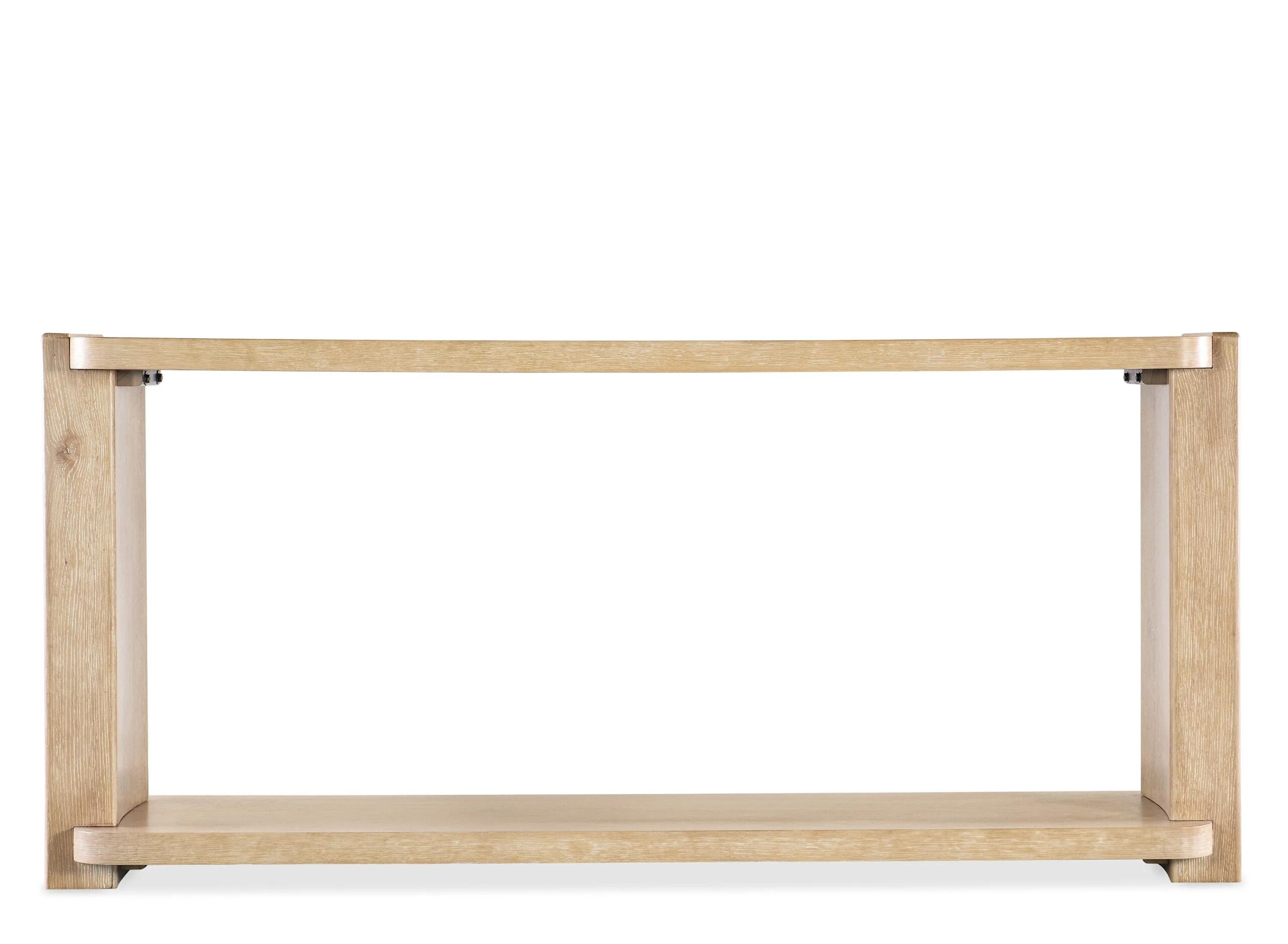 The Retreat Console Table has a tranquil personality with a modern twist. Simple, clean lines are in a rectangle shape with rounded corners and interlocking block-style legs. Crafted of Oak Veneers, it is finished in the sand-colored Dune, transparent by design to reveal the unique grain patterns