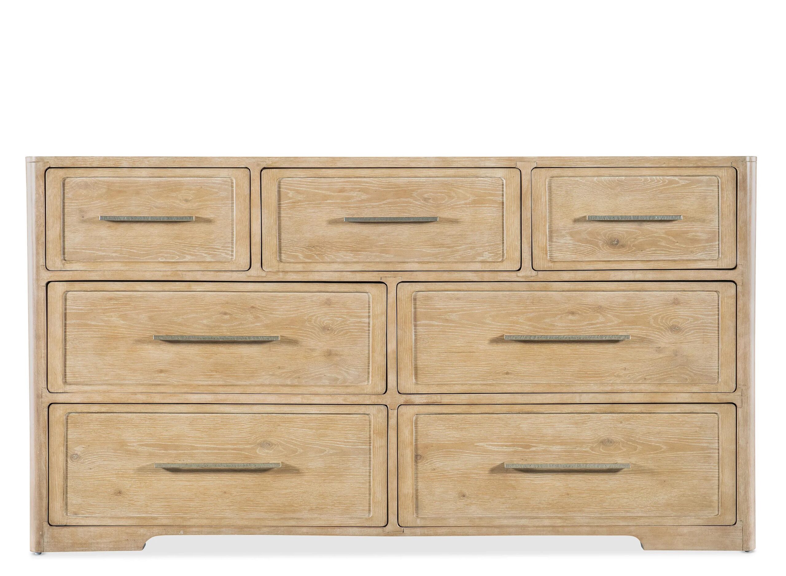 The Retreat Dresser has a tranquil personality with a modern twist and organic, textured pewter bar pulls. Crafted of Oak and Maple Veneers, it is finished in the sand-colored Dune, transparent by design to showcase the unique grain patterns of the veneer.