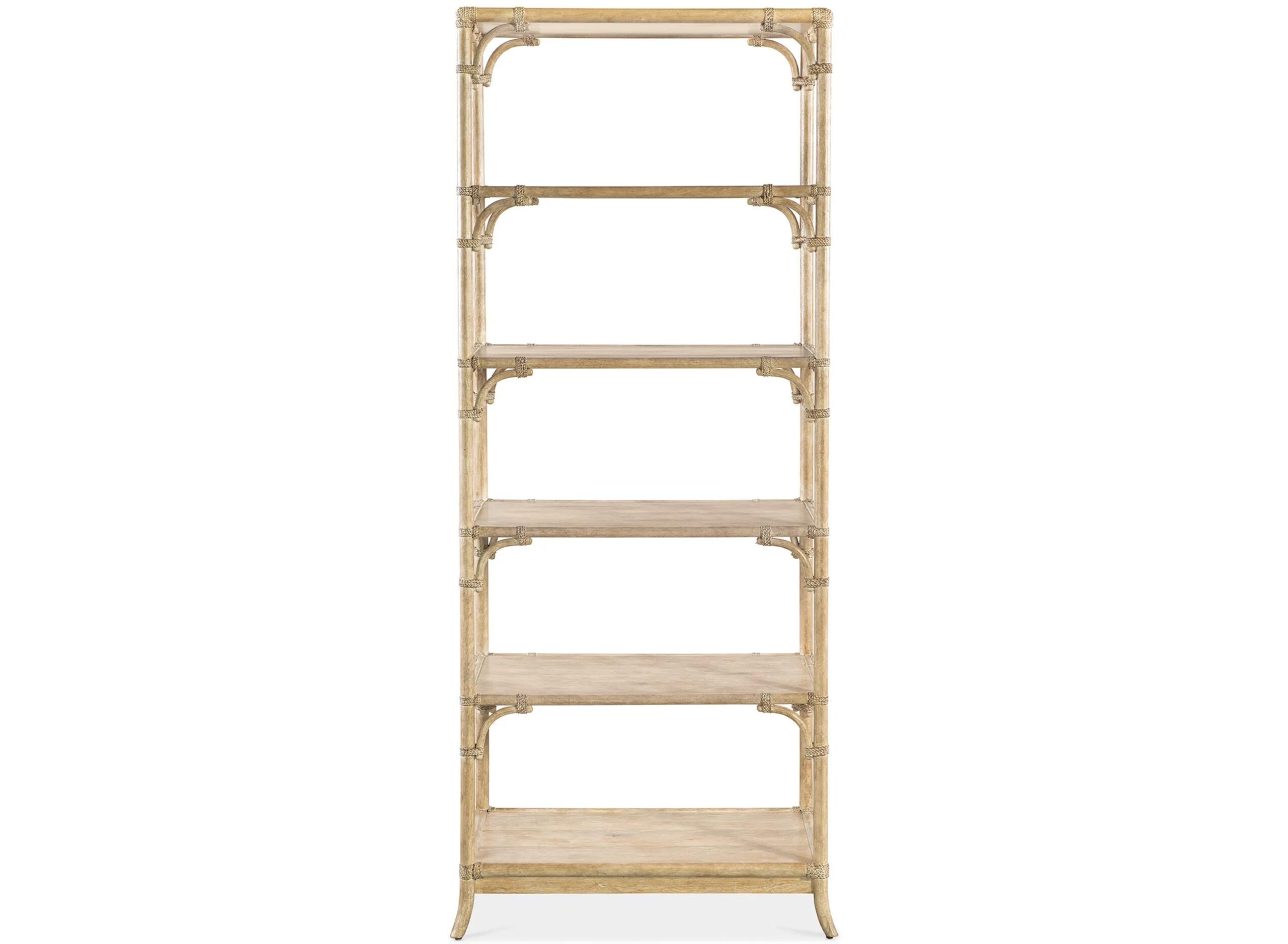 Retreat Pole Rattan Bookcase is crafted of Oak Veneers featuring a Bamboo motif and rope accents for an organic appeal. Finished on all sides with five fixed shelves, the bookcase is finished in the sand-colored Dune, transparent by design to showcase the unique grain patterns of the wood veneer.