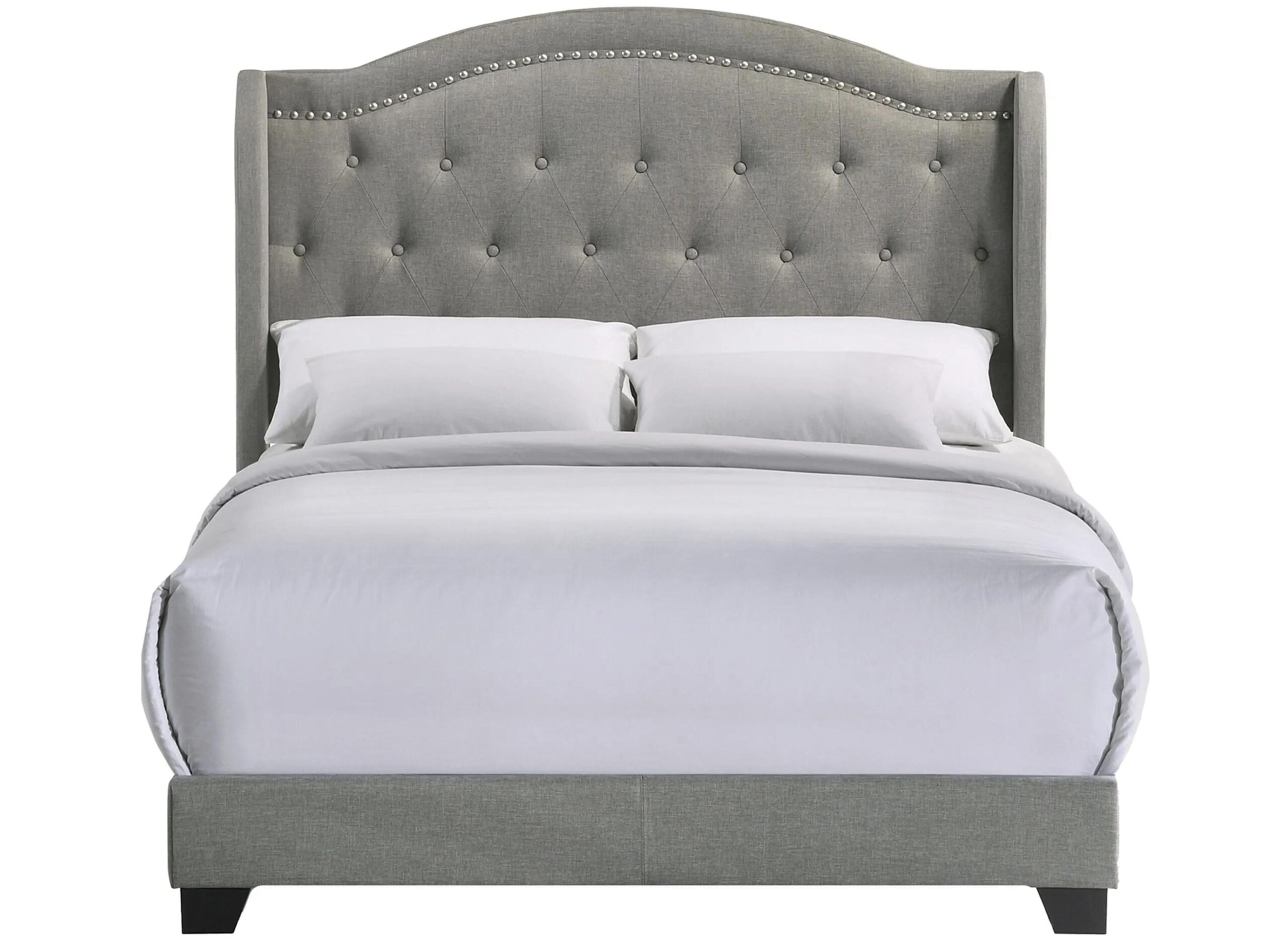 The Rhyan Upholstered Bed Collection features a Smoke Fabric covering an Tufted Cushion, Arched Headboard with eye-catching Matte Chrome Nail Head Accents. The Poplar and Rubberwood Construction rounds out this collection, making it not only stylish but durable as well.