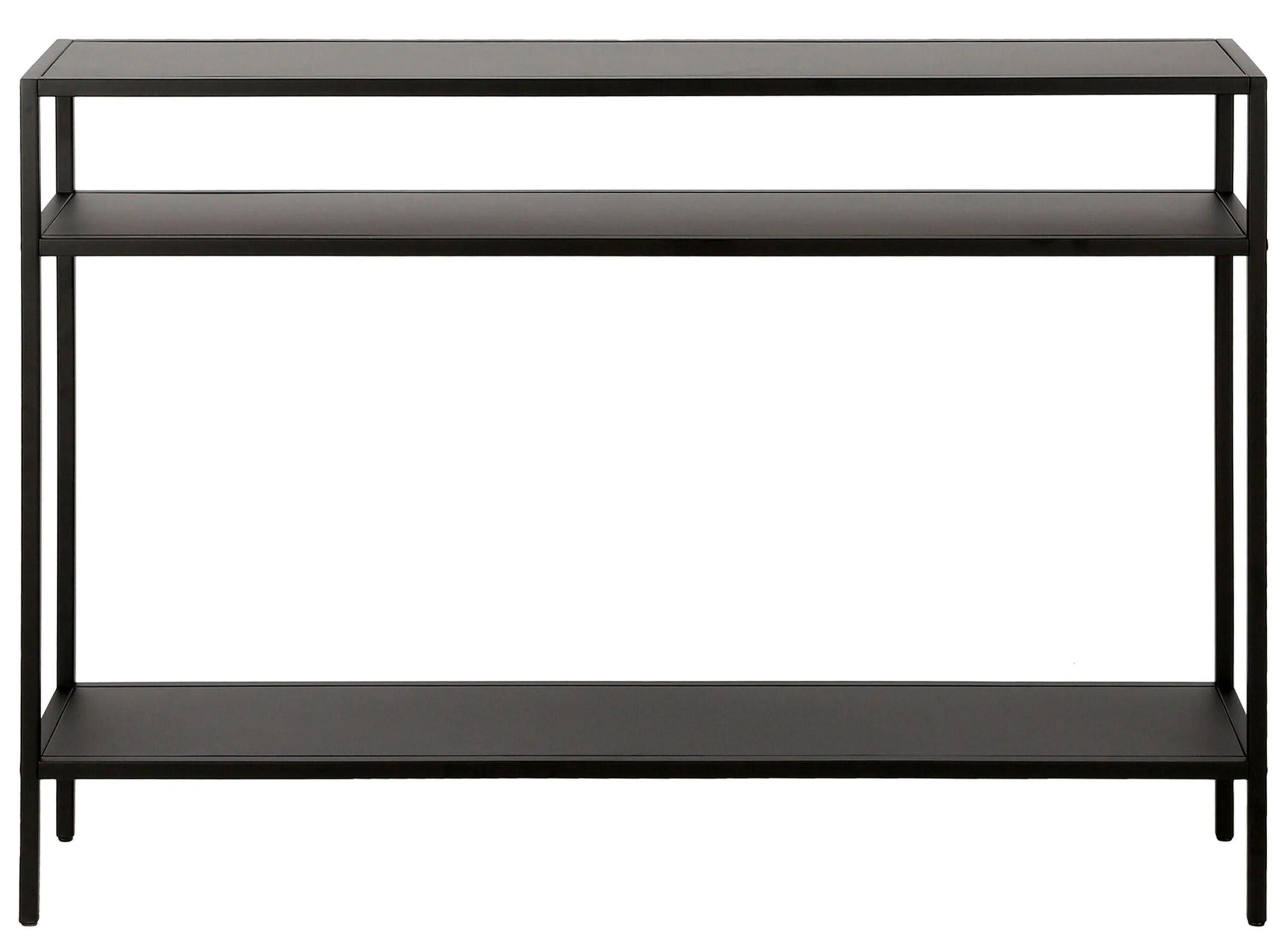 Clean-lined industrial styling gets a contemporary update with the modern blackened bronze finish of this accent table. It’s solid metal shelves provide the perfect backdrop for your decorative items, floral arrangements, or statement lamps.
