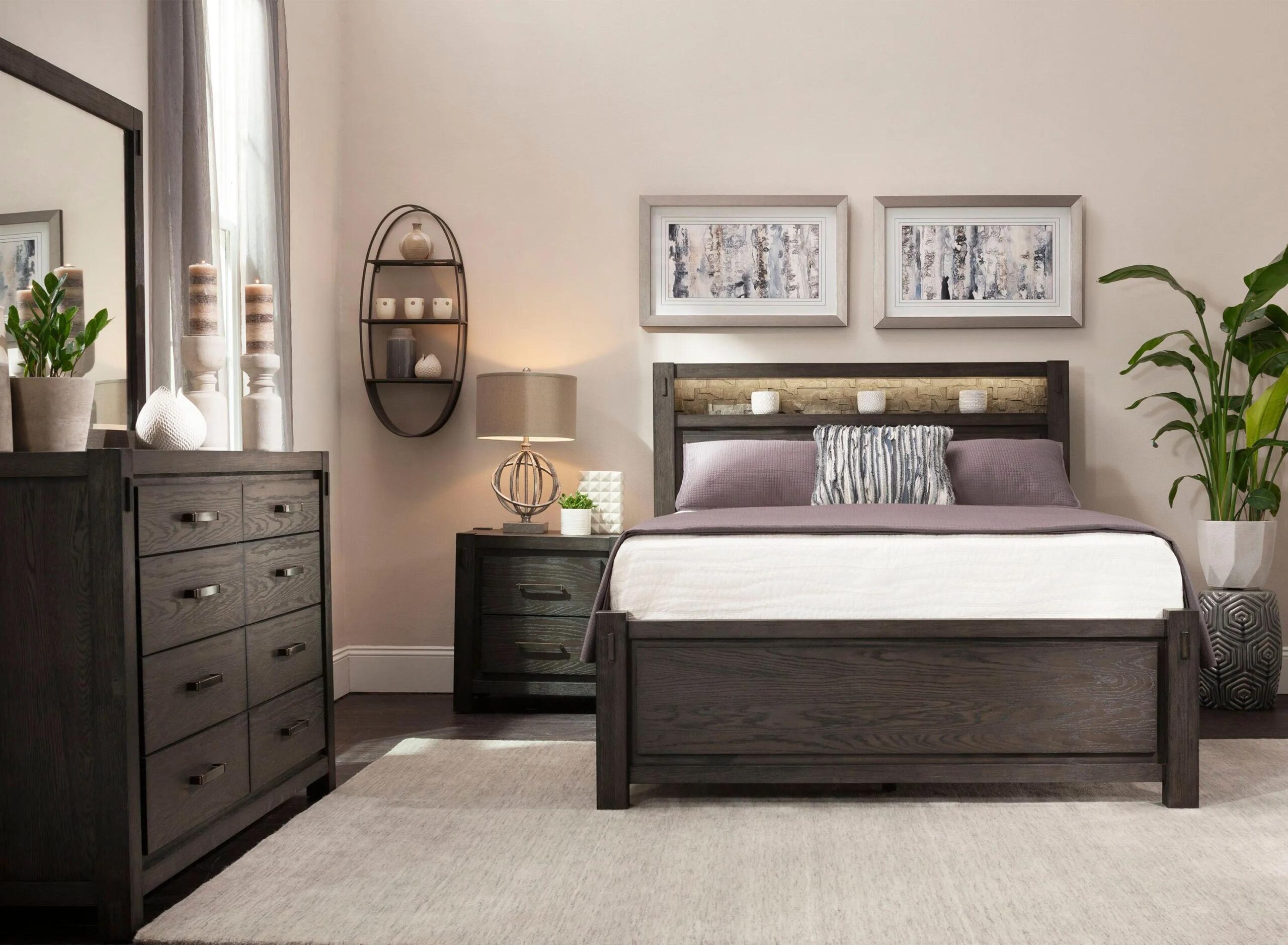 The Rockwell 4-pc. Bedroom Set blends casual styling with functionality. The bed features headboard lighting. What’s more is the stunning deep wood tone of each piece, which matches well with any decor scheme.